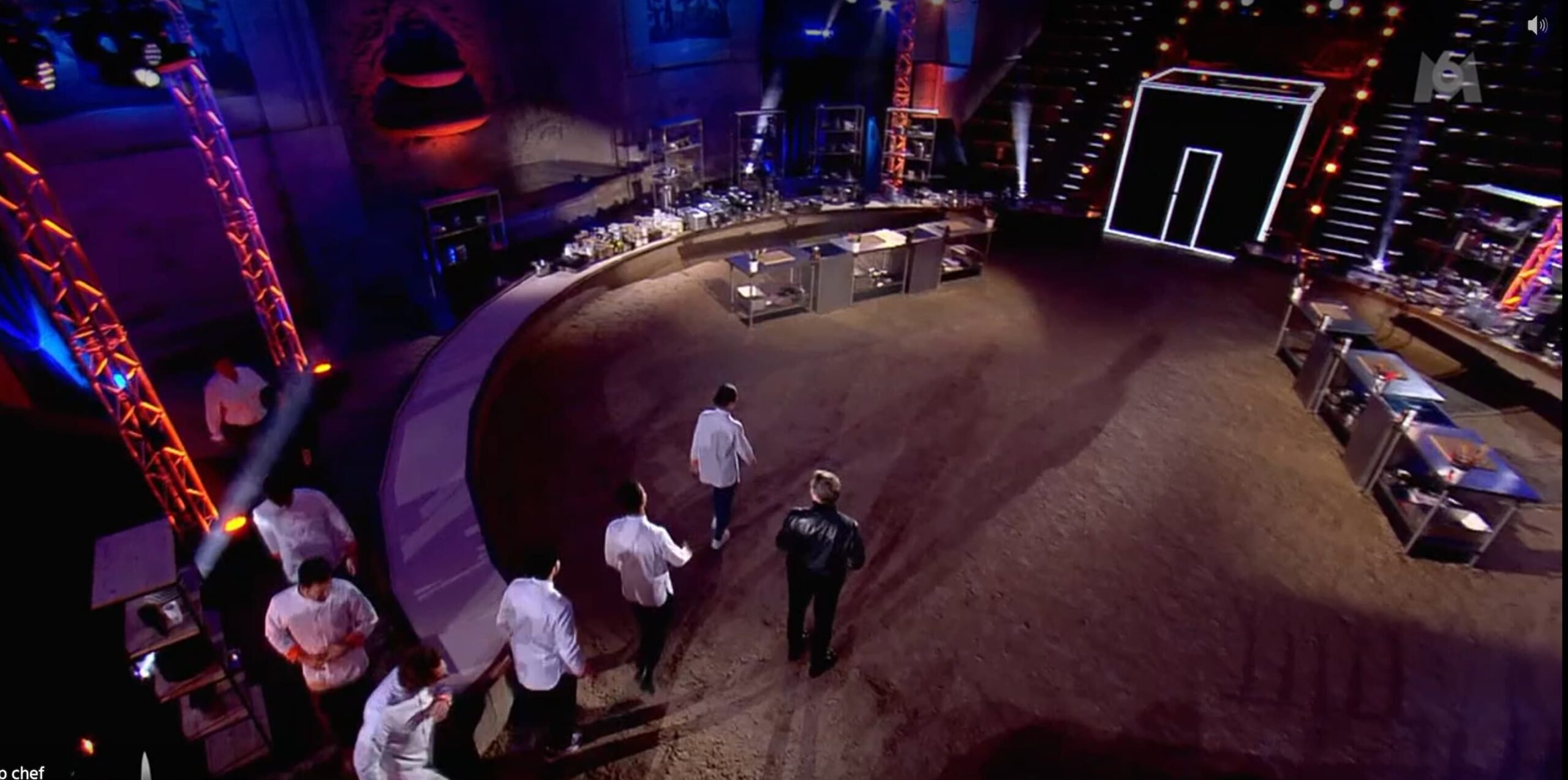 Philippe Etchebest commence en motivant les gris comme seul lui sait faire : en leur hurlant dessus et en les regardant comme s'il allait les utiliser pour détruire un mur. Et en même temps ils ne sont plus que quatre alors que les orange sont six, faut arrêter de déconner. MAIS CETTE ANNÉE LA BOITE NOIRE EST UNE ÉPREUVE ÉLIMINATOIRE. Ça veut dire que ça peut dégager au moindre pet de travers, j'en profite d'ailleurs pour rappeler qu'il n'est pas très hygiénique de péter en cuisine. Mais avant de passer à la boite noire les équipes doivent s'affronter sur deux épreuves : l'omelette et la meringue italienne.
