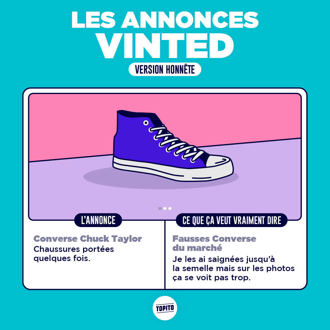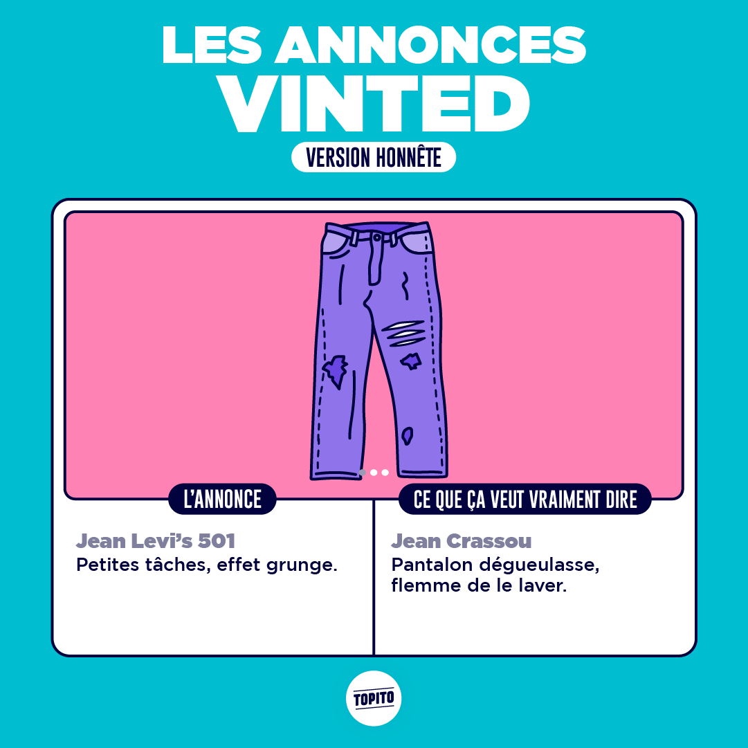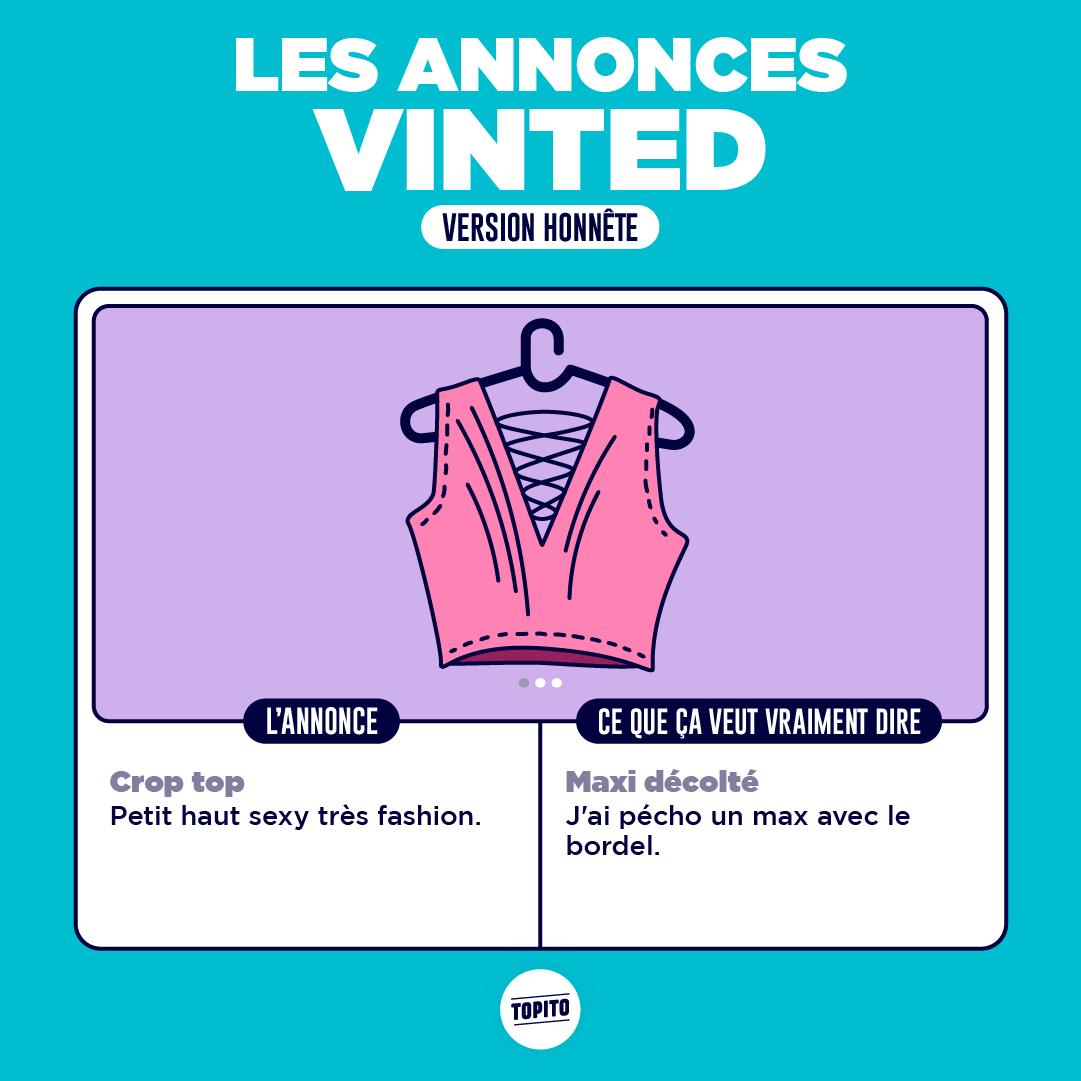 Un jour une amie m'a parlé de Vinted et c'est un peu comme si elle m'avait refilé une maladie orpheline. Avant je faisais pas de shopping et maintenant j'achète des trucs de merde pour 3 balles à longueur de journée en négociant 50 centimes comme une vieille raklo. Mais que suis-je devenue ? Enquêtons de manière illustrative sur ce phénomène vestimentaire.
