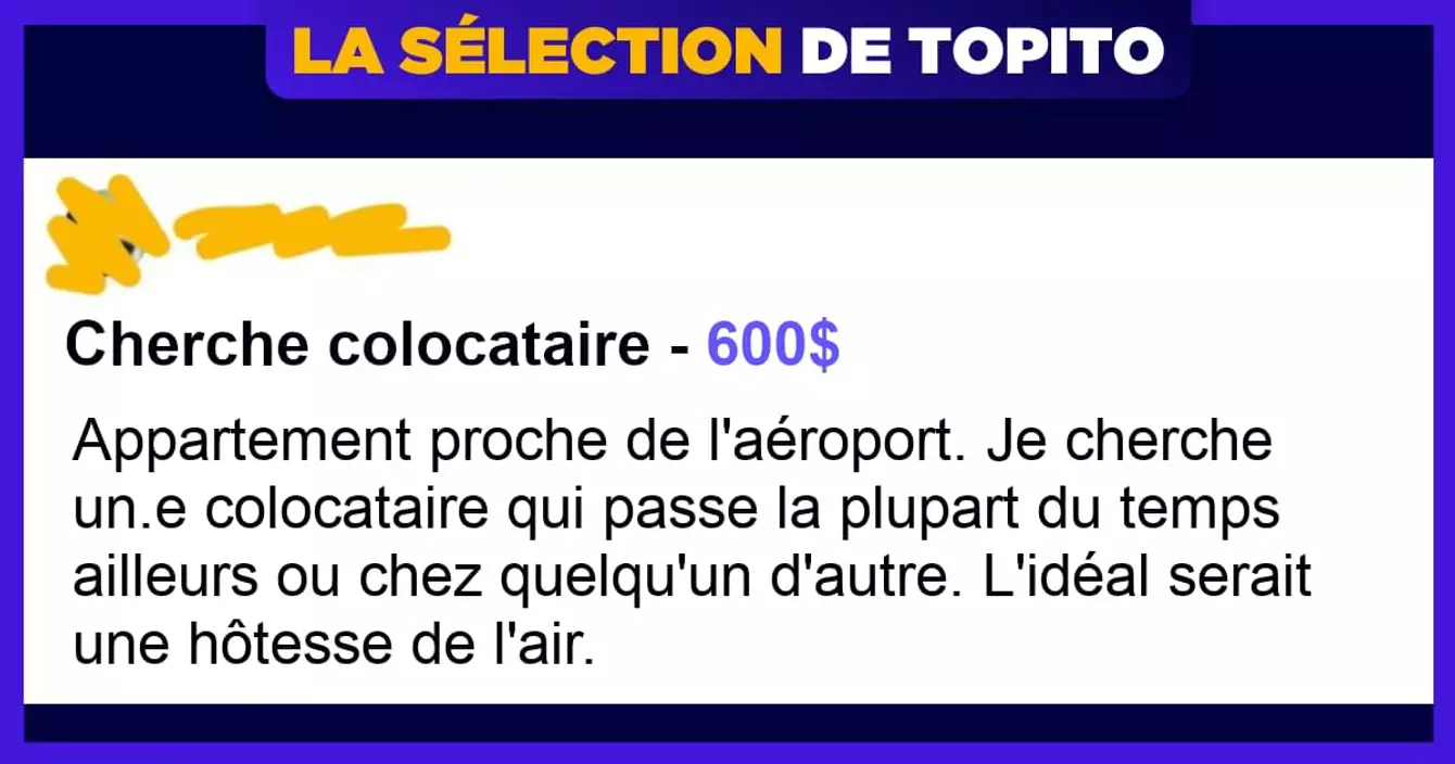 « Je cherche quelqu'un qui est prêt à vivre dans mon appartement de trois chambres pendant que je n'y suis pas et qui est prêt à payer 1500$ par mois pendant six mois et à faire du babysitting aléatoirement pendant les six mois, avec un préavis d'au moins un mois si je suis absent du jour au lendemain ? Une idée ??? »