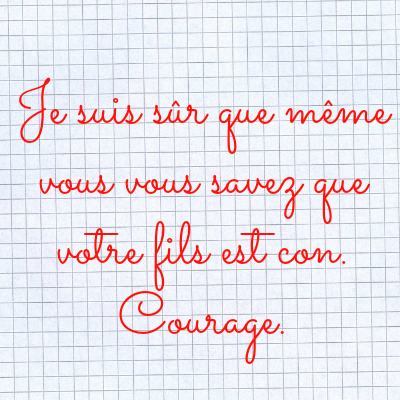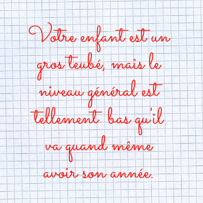 On les connaît bien les profs, ils font bonne figure devant les parents, mais au fond ils en ont marre des gosses qui leur pourrissent la vie. Résultat, on a le droit à des appréciations assez neutres sur les bulletins alors que s'ils pouvaient ils se lâcheraient bien comme il faut. Mais ils peuvent pas, pour pas se faire péter la gueule par les parents et se faire virer. Donc nous on va révéler ce que veulent vraiment dire ces petits messages formatés, et on peut dire que les gamins prennent un peu cher.