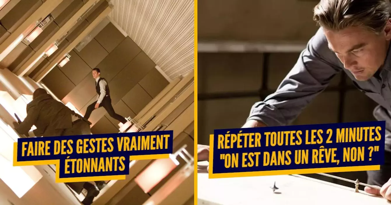 N'essayez pas de comprendre comment on a eu l'idée de faire ce top, mais plutôt pourquoi on en a eu l'idée : vous avez fait une petite connerie et vous essayez de vous en sortir par tous les moyens mais vous n'y arrivez pas ? Avez-vous seulement pensé à la méthode Inception ? Non, évidemment vous n'y avez pas pensé, parce que faire croire à quelqu'un qu'il est dans un rêve ne vous a pas traversé l'esprit vu que vous êtes rationnel, terre à terre et que vos ongles sont sales. Ne cherchez plus, ces conseils vont vous aider à sauver les meubles du bourbier dans lequel vous venez de vous mettre.