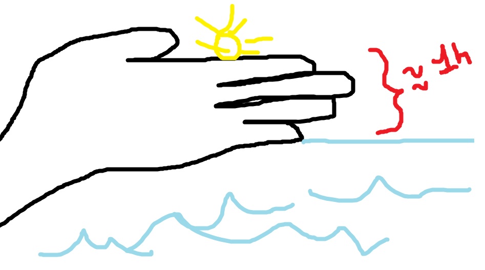 Bon en général tu sais à peu près quand il va faire nuit parce qu'à moins de débarquer dans un pays que tu connais pas, tu es quand même un peu habitué.e au concept de nuit et de jour et que généralement tu sais à peu près quand il va faire nuit. Mais bref. Au cas où, il te suffit de mettre ta main à l'horizontale de façon à ce que le soleil soit au dessus de l'index. Chaque doigt qui sépare le soleil de la ligne d'horizon représente à peu près 15 minutes. Vous n'avez rien compris ? OK je sens que vous réclamez un Paint.