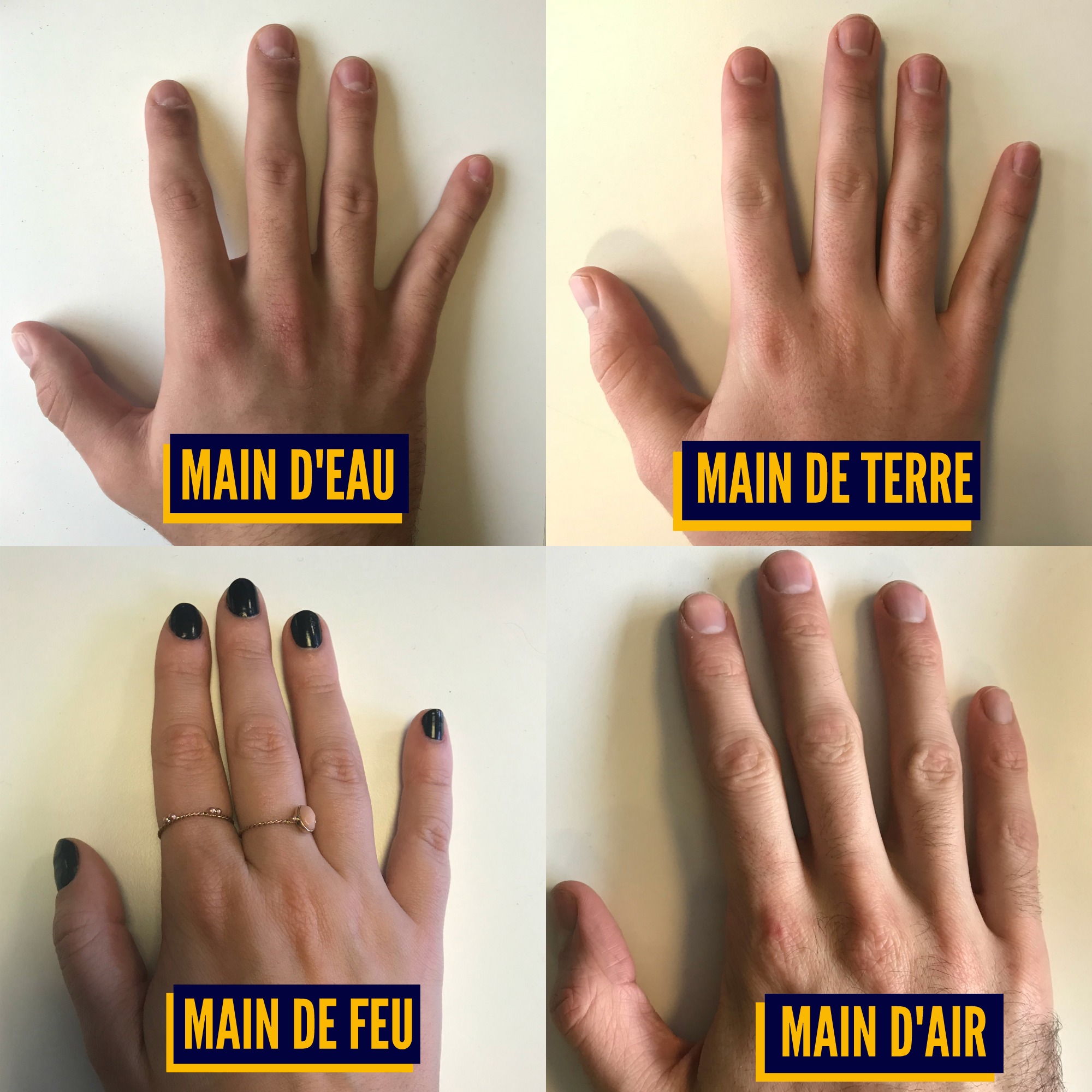 Main fine et ovale, doigts assez palmés : la main d'Eau. Les personnes à mains d’eau sont des personnes très douées pour s’adapter à différentes situations et sont très attentives aux autres. Discrets, prudents, et secrets, ce sont des personnes très agréables qui préfèrent la réflexion à l'action.