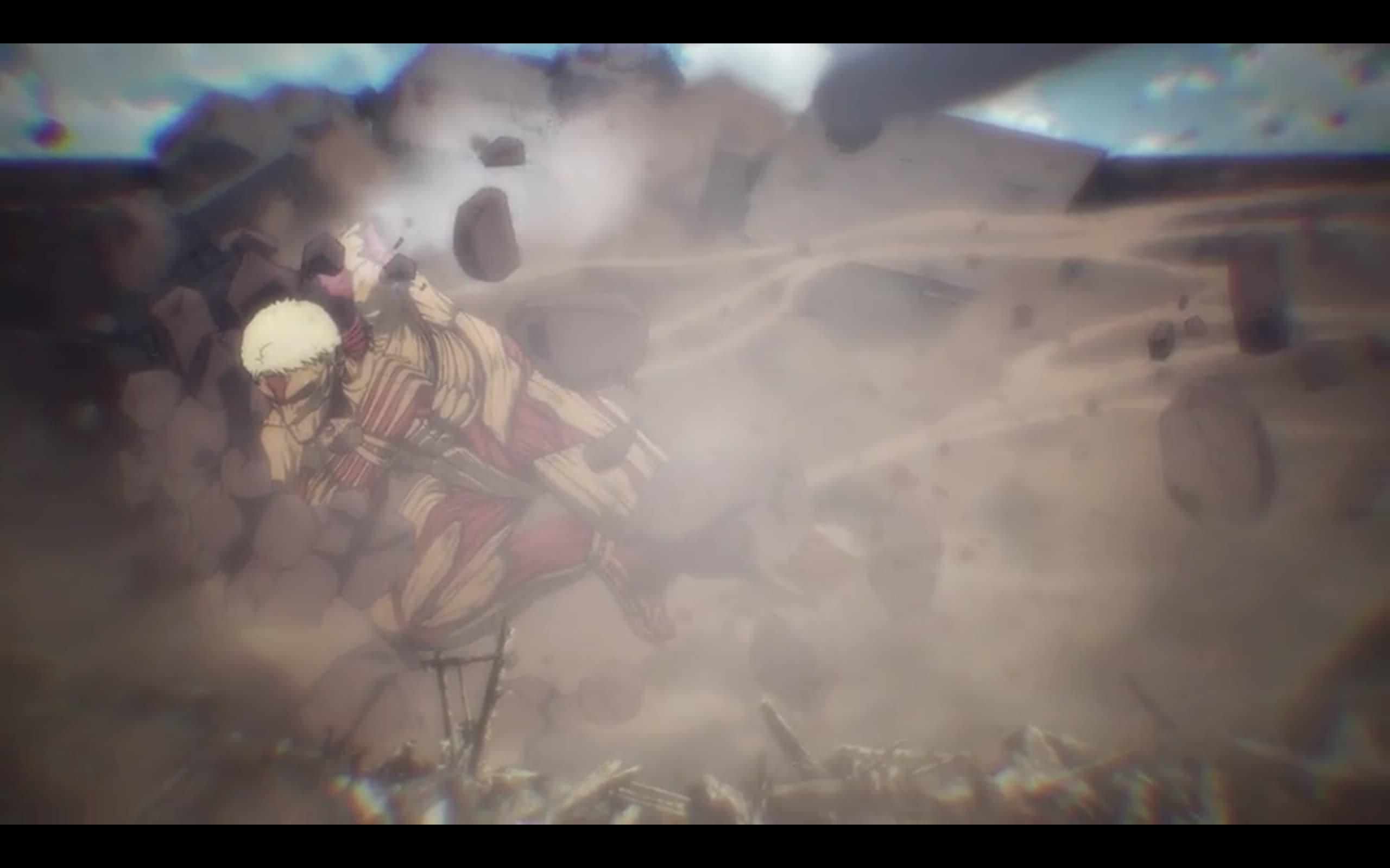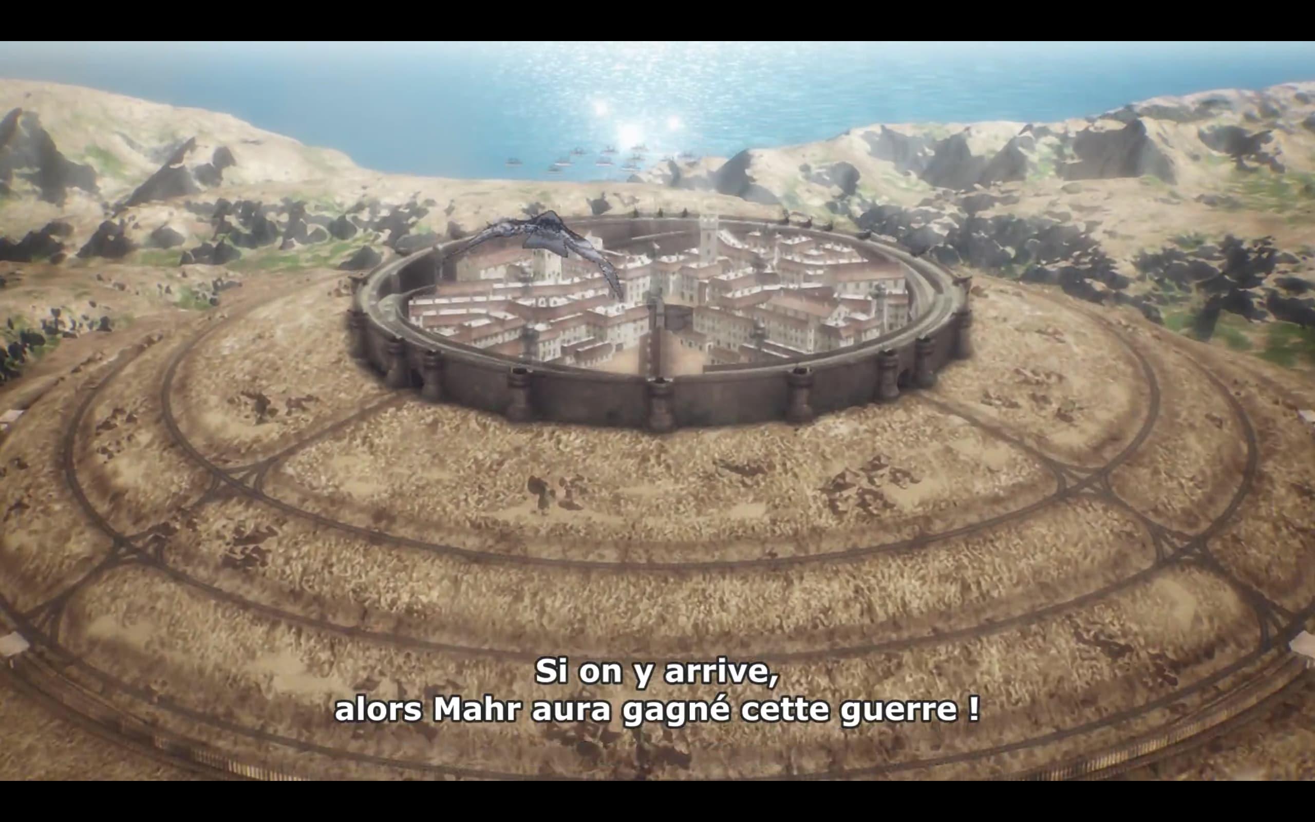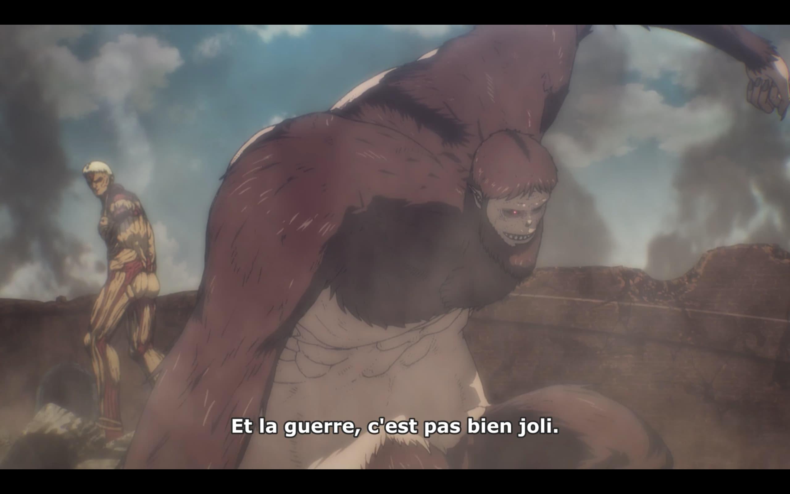 Et suite à la perte de deux Titans (le Féminin de Annie et le Colossal de Bertolt), la République de Mahr s’est vue affaiblie. Résultat, les forces armées du Moyen-Orient ont tenté leur chance et déclaré la guerre à Mahr. 4 ans de conflit après, cet épisode en raconte la fin.
