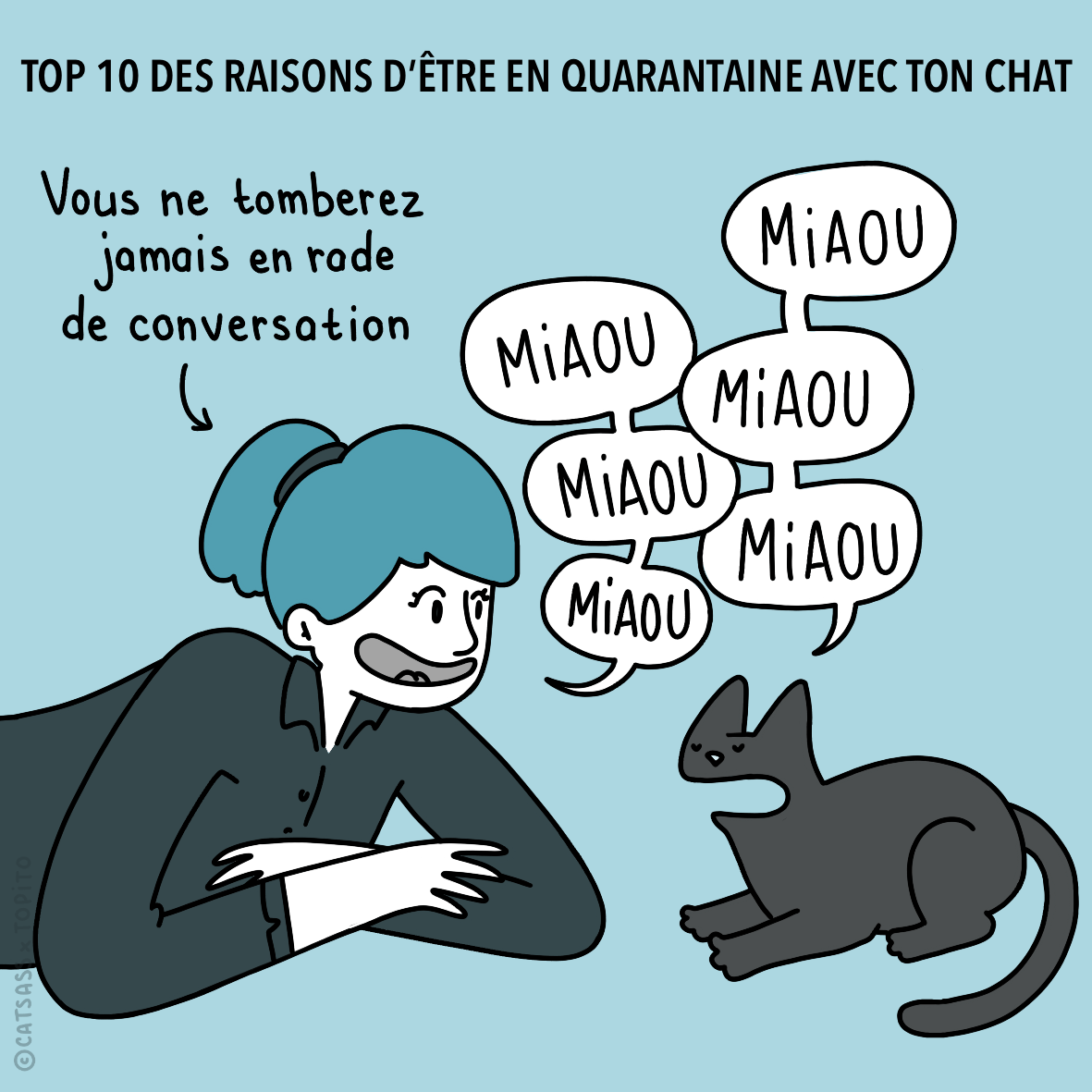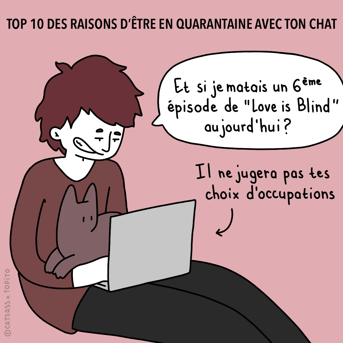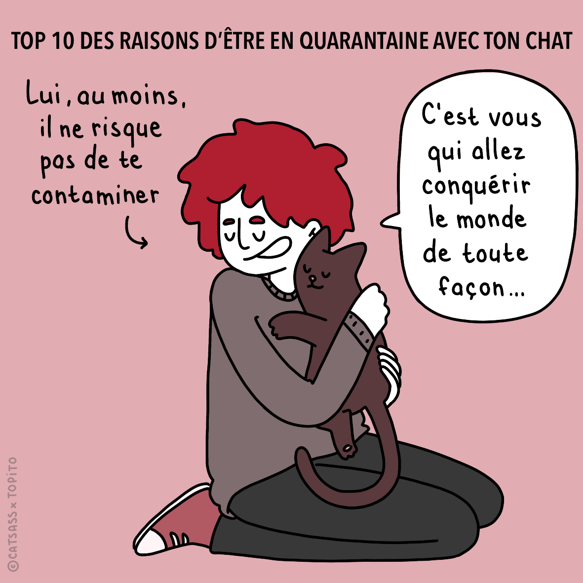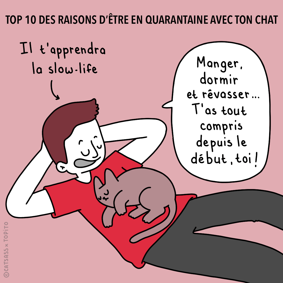 Se confiner c'est bof. On s'ennuie vite, on a la flemme de bosser, faire du sport je n'en parle pas et le soleil et les potes nous manquent. Mais se confiner avec un chat c'est une autre histoire. Car ce n'est que du bonheur en boule de poils. Voici 10 raisons d'être en confinement avec un chat, réalisé par la merveilleuse Catsass.