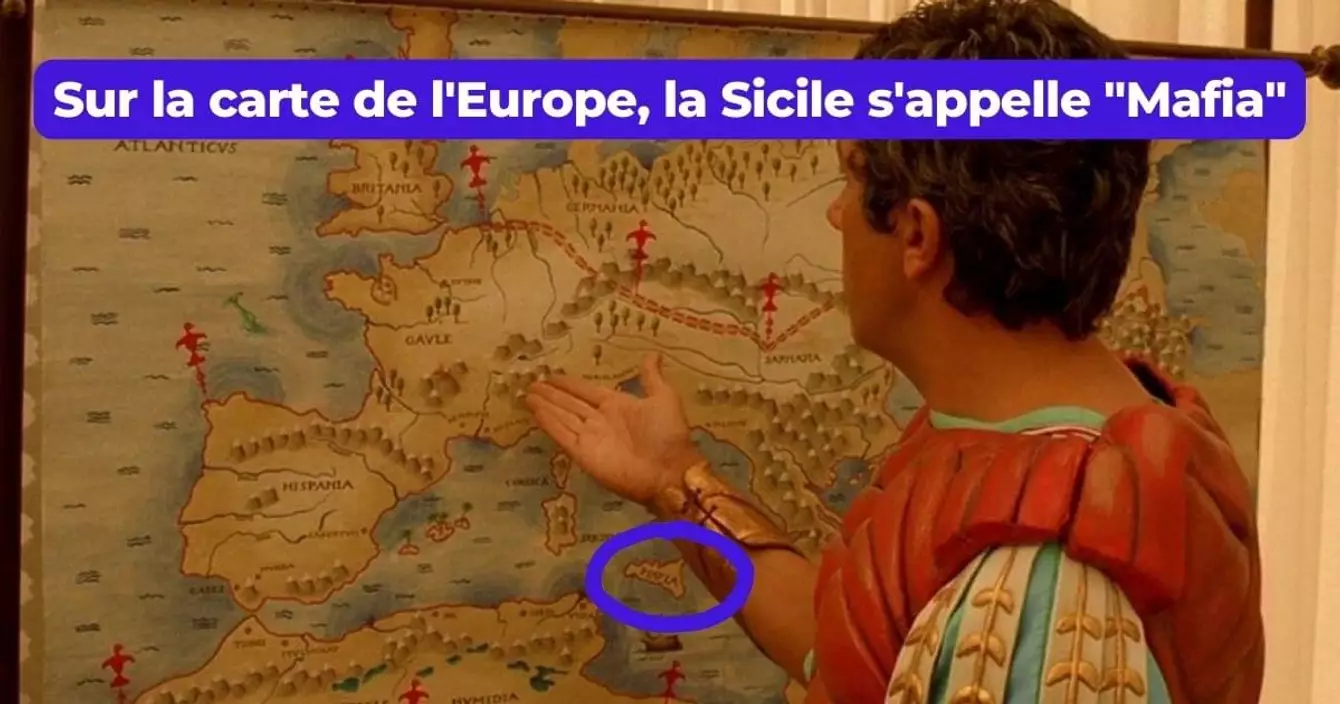 C'est la vanne où il faut avoir un oeil perçant et surtout prendre le temps de bien lire parce qu'à première vue on peut rapidement la manquer. Lorsqu'on regarde la carte de l'Europe derrière César on réalise qu'à la place du mot Sicile est écrit le mot Mafia. Y'en a qui disent que c'est un clin d'oeil au Parrain mais faut pas déconner.