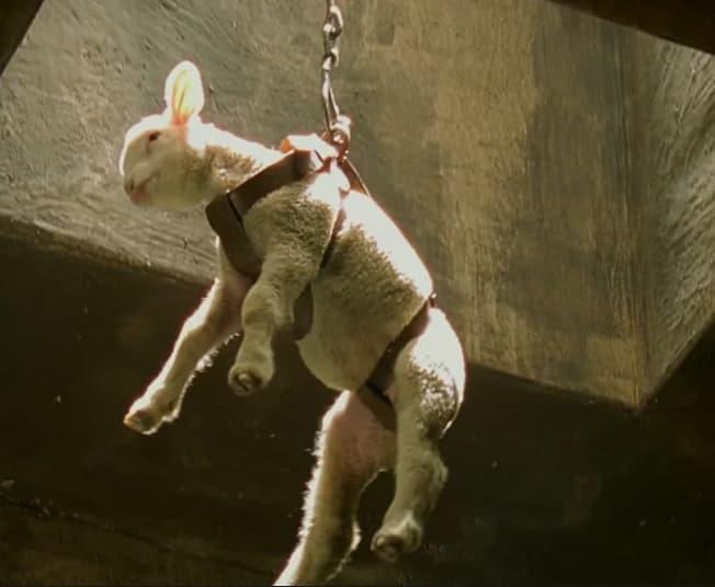 Celle-ci est évidente pour les gens qui ont vu le film, forcément on reconnait tout de suite la scène de la vache qui arrive dans l'enclos du t-rex quand on voit l'agneau se faire donner à bouffer aux crocodile. Après si vous n'avez pas vu Jurassic Park franchement je ne peux rien pour vous, personne ne pourra rien pour vous d'ailleurs.