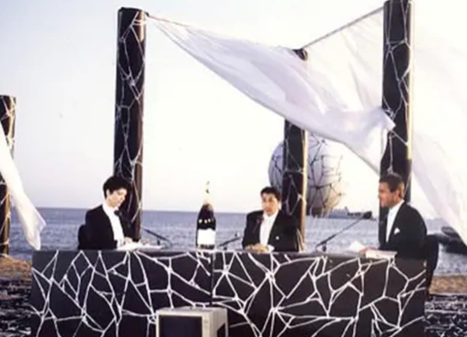 Alors par contre si vous aviez remarquée celle-ci c'est que vous êtes un véritable fan des Nuls, ou alors que vous avez travaillé sur la construction des deux décors. Dans les deux cas donnez moi votre prénom, ce sera celui de mon enfant à venir. On peut effectivement reconnaitre les colonnes en marbre noir et blanc qui composaient le plateau des Nuls à Cannes quelques années auparavant, un clin d'oeil sympathique.