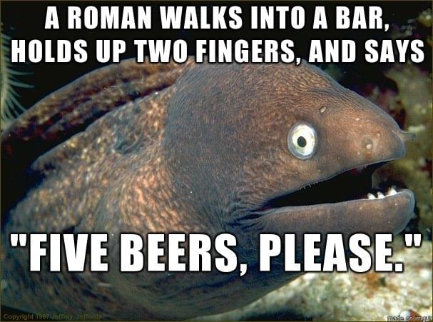 Un Romain entre dans un bar, tend deux doigts et dit : « 5 bières s'il vous plaît ! »