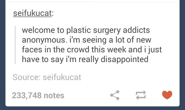 « Bienvenue à cette réunion des accros à la chirurgie esthétique anonymes. Je vois beaucoup de nouvelle tête dans la foule et je dois dire que je suis très déçu. »