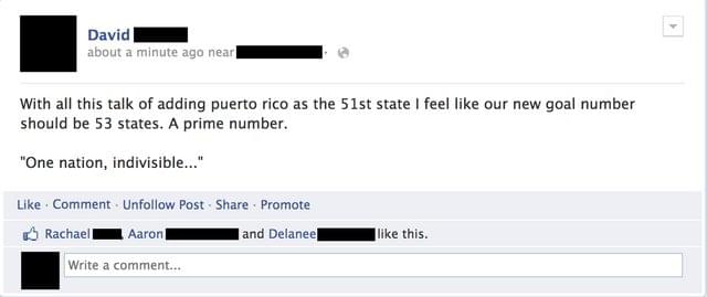 Avec toutes ces discussions sur l'opportunité ou non de faire de Porto-Rico le 51ème Etat, j'ai l'impression que notre nouvel objectif devrait être d'avoir 53 Etats. C'est un nombre premier. « Une seule nation, indivisible… »