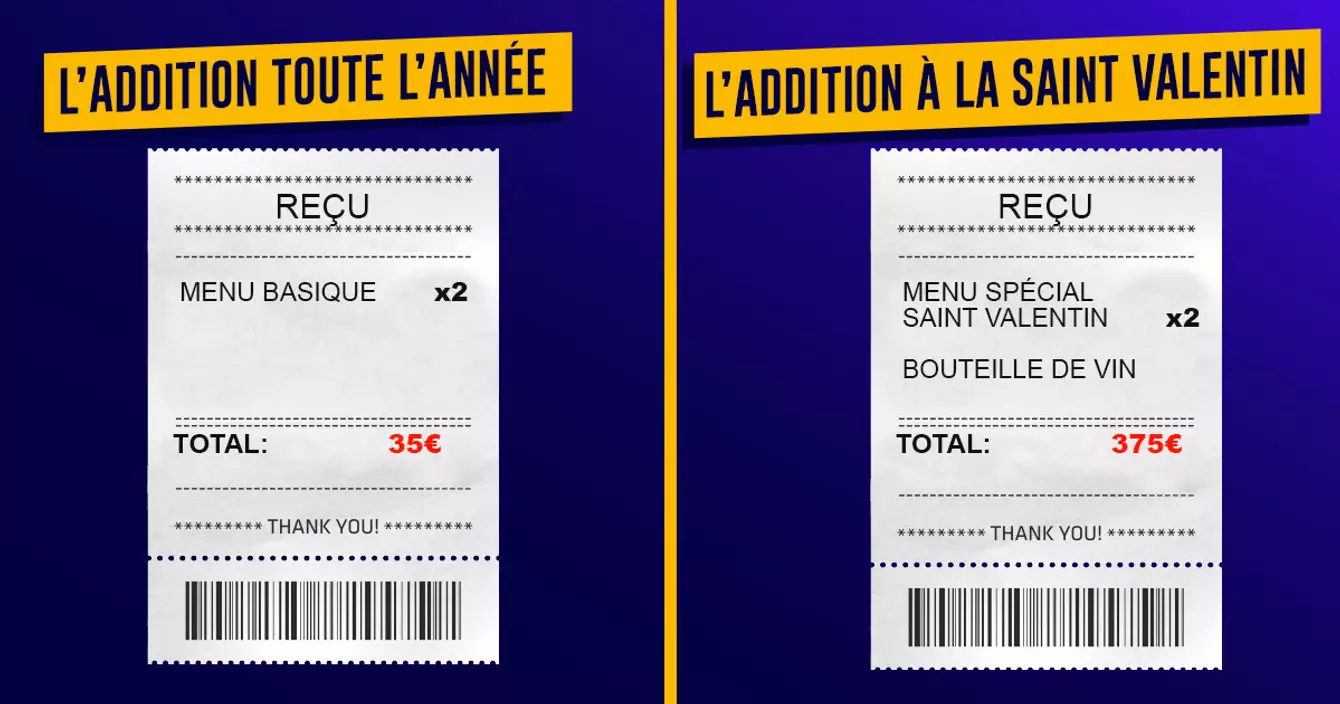 À la Saint-Valentin, ces petits malins de restaurateurs prévoient un menu spécial pour les amoureux. Et qui dit menu spécial dit que ça coûte bonbon. Quand d'habitude tu t'en sors facilement pour moins de trente euros par personne, là tu dis au revoir au peu d'économies qu'il te restait après les soldes. Avec une petite larme au coin de l’œil.