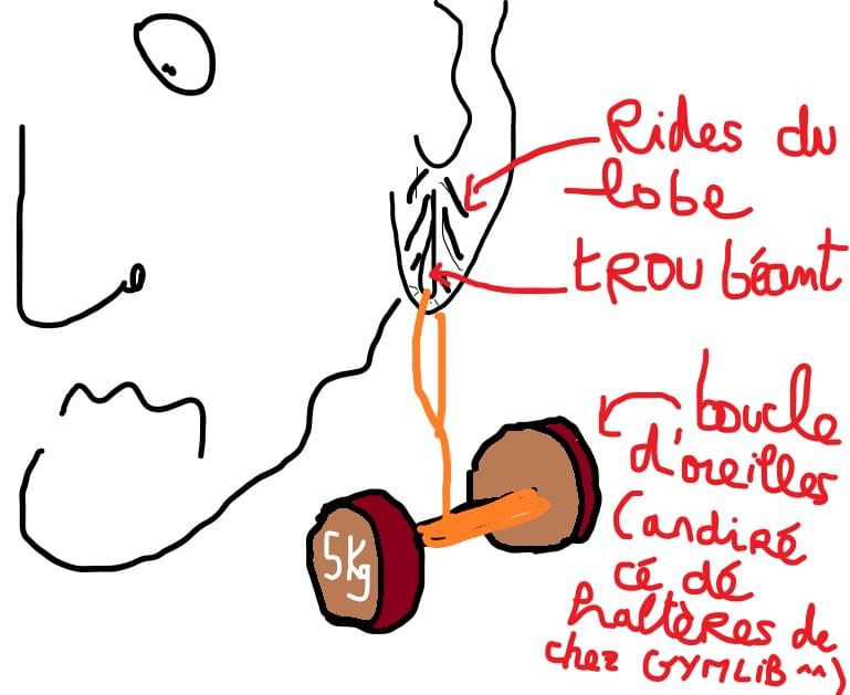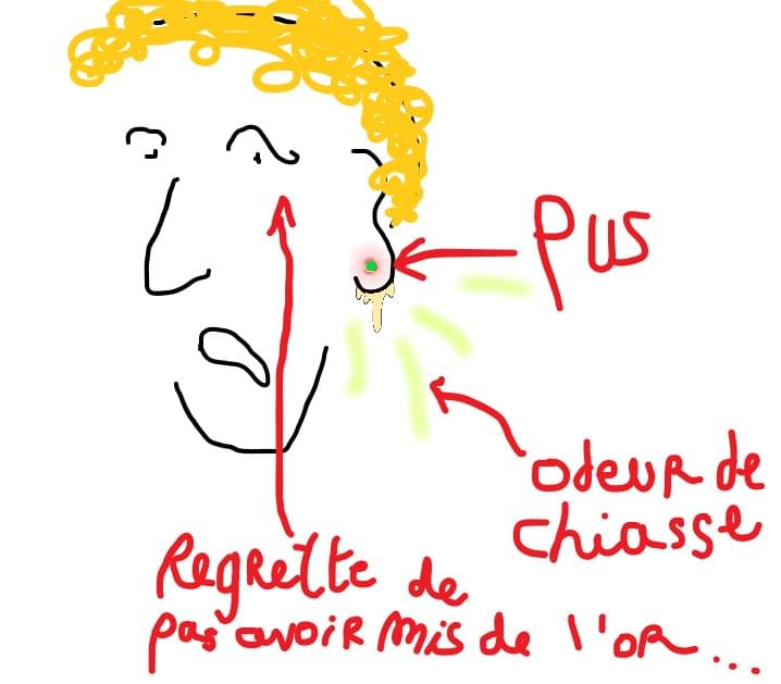 Tu es une grosse bouse faignante. Depuis qu'on t'a percé les lobes tu n'as pas changé de clous. Tes oreilles s'infectent au jour le jour et tu devras attendre qu'elles tombent par terre pour envisager une nouvelle zone à percer.