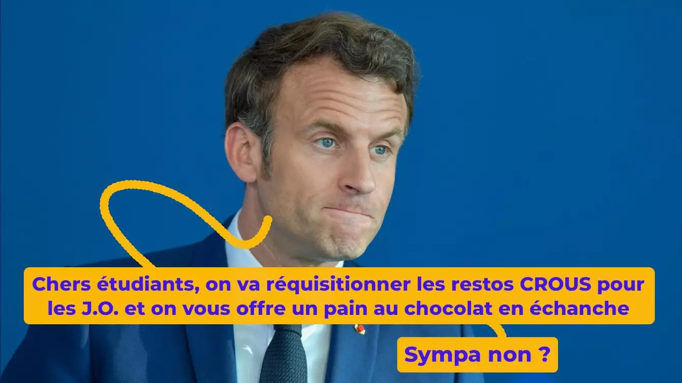 Vous n'êtes pas sans savoir que le gouvernement a gentiment réquisitionné 2000 logements étudiants pour loger le personnel soignant, les pompiers et autres personnes de la sécurité civile pendant les Jeux Olympiques. Après tout, on va quand même pas s'emmerder les iouks avec les étudiants qui sont de toute façon déjà en galère et qui devraient pas moufter. En plus, le gouvernement est trop sympa, il leur file en échange 100 euros de dédommagement pour se faire virer de chez eux, et 2 places d'une valeur inestimable pour aller aux JO. Si ça c'est pas généreux je me demande ce qu'il vous faut.
