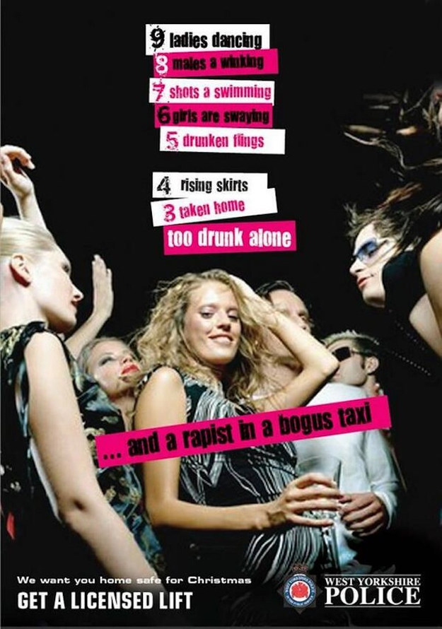 Encore une campagne anglaise du West Yorkshire datant de 2013 qui a l'air de dire que si tu bois de l'alcool, tu t'exposes sciemment aux dangers du viol. Alors, on le répète : non, le problème ne vient pas des victimes, mais des agresseurs.
