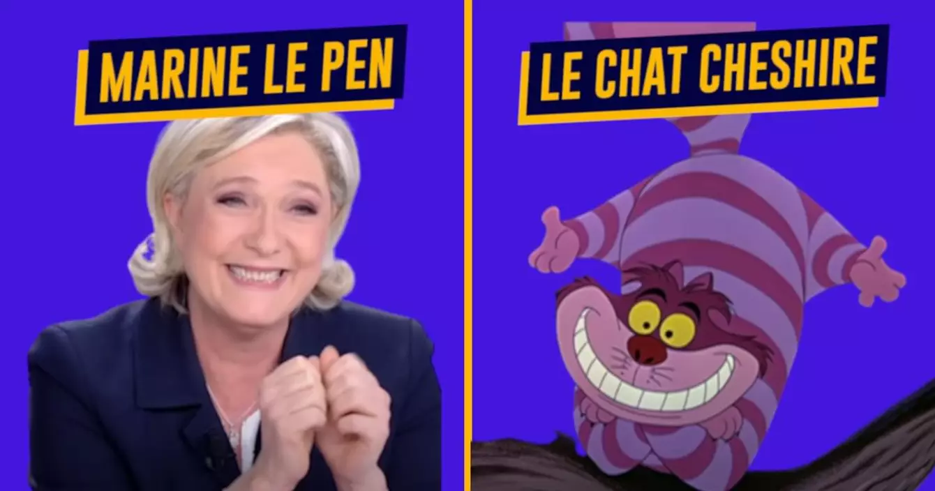 Le Pen aime les chats, Cheshire EST un chat. Déjà, c'est assez convaincant, mais ce n'est pas tout : le chat Cheshire prend un malin plaisir à jouer des tours à Alice avant de la voir rentrer dans son pays… Vous voyez où je veux en venir ? Pour finir, on est ok que ce sourire forcé en toute circonstance, à quelques dents près, c'est exactement le même sur les photos de gauche et de droite ?