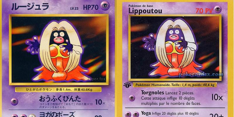 C'est l'une des cartes du Pokémon Lippoutou qui a clairement posé un gros problème en arrivant aux États-Unis. La couleur noire du Pokémon ainsi que les lèvres roses faisaient penser à certaines caricatures raciales et on a donc tout simplement décidé de changer la couleur du Pokémon en lui donnant le ton violet.