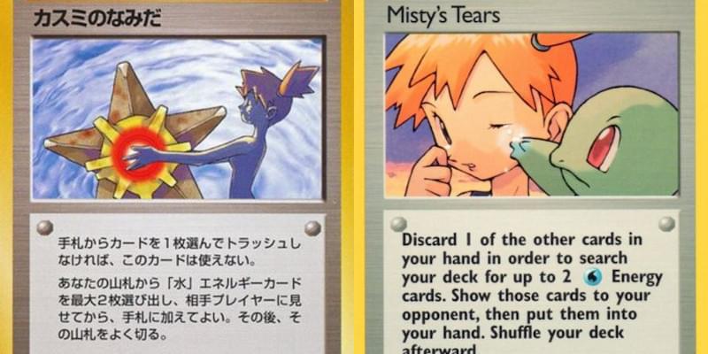 Cette carte représentant Ondine avec son Pokémon Stari passait plutôt mal parce qu'on y voyait un bout de sein du personnage féminin nu. Alors montrer un bout de nibard à des gamins vous savez que ça passe généralement mal, du coup eh bien on a fait changer la carte pour l'occident et on a carrément dégagé Stari pour mettre Carapuce à sa place. Pour absolument aucune raison valable par contre.