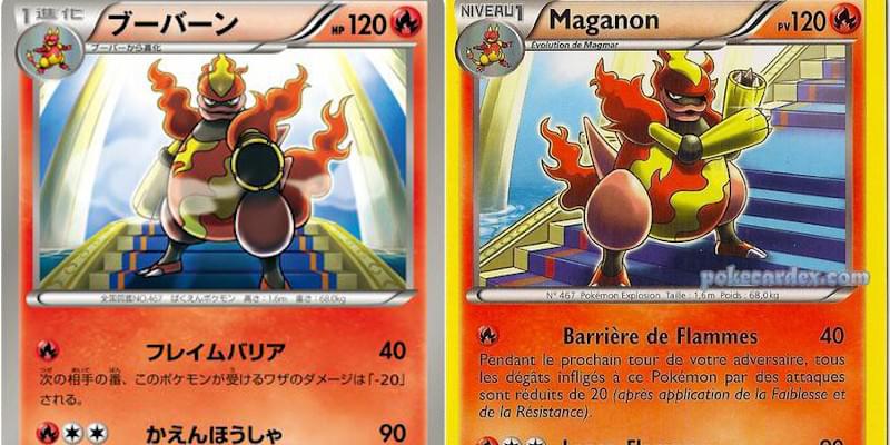 Bon alors là c'est un peu comme celle du doigt d'honneur, faut vraiment chercher pour trouver le truc gênant sur la photo : le Pokémon Maganon pointe son bras / bazooka en direction de la surface de la carte et donc de la personne qui la regarde. Forcément c'était trop violent pour les États-Unis et l'Europe qui ne sont généralement pas réputés pour vendre et promouvoir l'utilisation d'armes. Du coup hop, c'est remplacé.