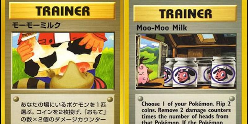Bon alors celle-là est un peu abusée quand même puisqu'on y voit un genre de fermier chopper le lait d'un Pokémon Meumeu (un genre de vache). Ça fait un peu trop exploitation animale forcée, du coup on a décidé de remplacer tout ça par plusieurs bouteilles de lait de Meumeu, ce qui revient à montrer le résultat sans montrer l'action, comme de montrer une boite de nuggets sans montrer les petits poussins. Eh ouais, même le monde des Pokémons est basé sur l'exploitation de ces braves bestioles.