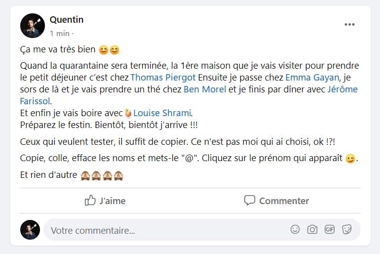 On s'ennuie, les gens s'ennuient, et quand tout le monde s'ennuie, qu'est-ce qu'il se passe ? Ils postent des trucs sur Facebook. En ce moment, c'est le festival des chaînes que tout le monde relaie (c'est le principe d'une chaîne). Il y en a de toutes les sortes, avec des gens à tagguer, des photos de soi à partager, ou encore des musiques à diffuser. Bref, ça fuse de tous les côtés, et on doit le dire, il faudrait peut-être que ça s'arrête.