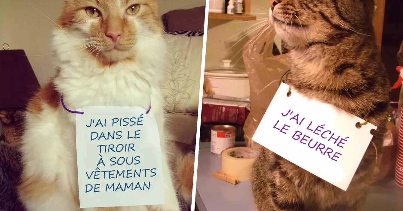 Ce n'est pas une découverte, on le sait, les chats sont de belles raclures, mignonnes certes, mais des raclures quand même. Un vomi par-ci, une souris morte par-là, sans compter les innombrables rouleaux de papier toilettes qu'ils ont pris plaisir à déchiqueter, mais contrairement à leur comparses les chiens, jamais une once de culpabilité ne traverse leurs yeux d'enfoirés. La preuve, même avec leurs conneries affichées au monde entier ils gardent cet air serein et dédaigneux qui leur est propre.