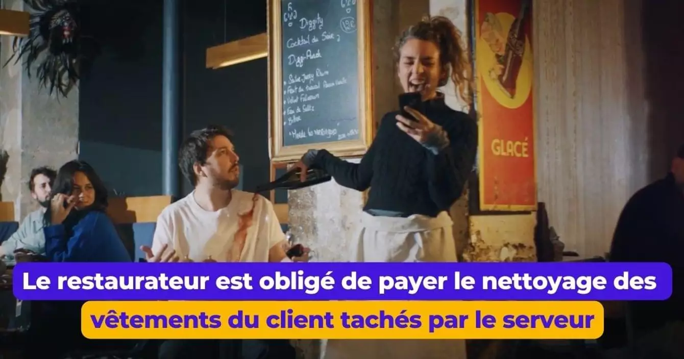Quand on est serveur, il arrive qu'un café, un verre de vin ou même un plat atterrisse malencontreusement sur le joli costume de cet homme d’affaires venu déjeuner avec des clients. C'est souvent un moment atroce où le serveur ne sait plus où se mettre, pendant que le client se demande comment il va faire pour finir sa journée. Ce n'est pas grave, ça arrive ! Dans ce cas-là, c'est le restaurant qui doit réparer le préjudice, en prenant à sa charge les frais de pressing ou même de teinturier. Pas d'inquiétude, ils ont des assurances pour ça. En revanche, n'accablez pas ce pauvre serveur, et ne lui demandez pas de rembourser de sa poche !