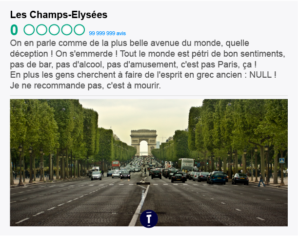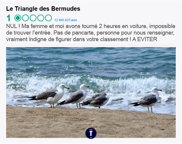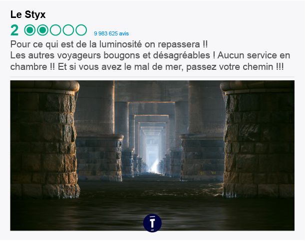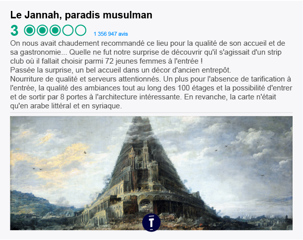 C'est pratique TripAdvisor ; tu peux avoir des avis hyper détaillés sur tous les endroits où t'es susceptible d'aller. Par exemple, si tu hésites à aller au paradis ou en enfer cet été, et bah tu peux mieux te décider grâce aux conseils des gens. Trop pratique on vous dit.