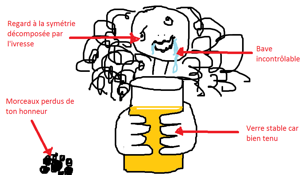 Il n'est pas tard. Mais comme toujours, tu as déjà trop bu. Parce que tu ne sais pas te modérer. Et puis un verre d'alcool c'est le meilleur moyen d'avoir un peu de contenance. Alors tu bois un verre, un deuxième verre, un troisième et tu commences à capter au cinquième verre que tu ne bois pas de la bière légère mais du vin blanc dégueulasse qui commence à t'attaquer sévère. Tu as du mal à articuler, tu parles un peu trop fort, tu tiens debout par miracle mais ça va tu fais encore bonne figure… un seul traître dans ce tableau de la honte : ton verre, que tu galères de plus en plus à tenir normalement.