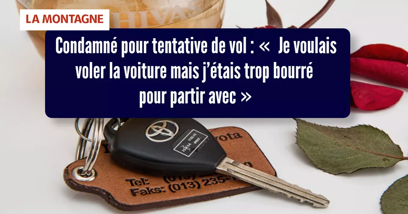Un mec du Puy-de-Drôme, multirécidiviste, a été condamné à 8 mois de prison pour avoir tenté de voler une bagnole. Le seul hic, et ce qui explique d'ailleurs qu'il ne soit pas allé au bout de sa démarche, c'est qu'il était beaucoup trop bourré pour la conduire. C'est ce qu'il a expliqué au tribunal. C'aurait été con de se faire retirer le permis en même temps.