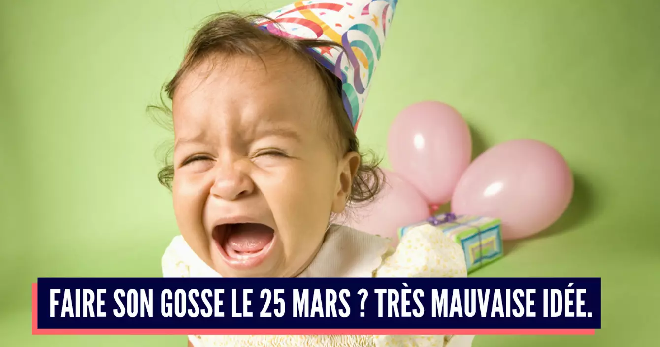 Pondre son chiard le 31 décembre, c'est vraiment la lie. Deux raisons à cela… Premièrement, s'il souhaite organiser une petite fête, il risque de se retrouver bien seul le soir du Nouvel An puisque tous ses camarades auront d'autres plans bien plus fun que celui consistant à le regarder souffler (voire cracher) sur ses bougies. Et deuxièmement, ce sera l'éternel benjamin de sa classe. Une place difficile à supporter. Si vous connaissez des gens qui accouchent ce jour-là, je vous en conjure ne leur faites pas de cadeaux de naissance.