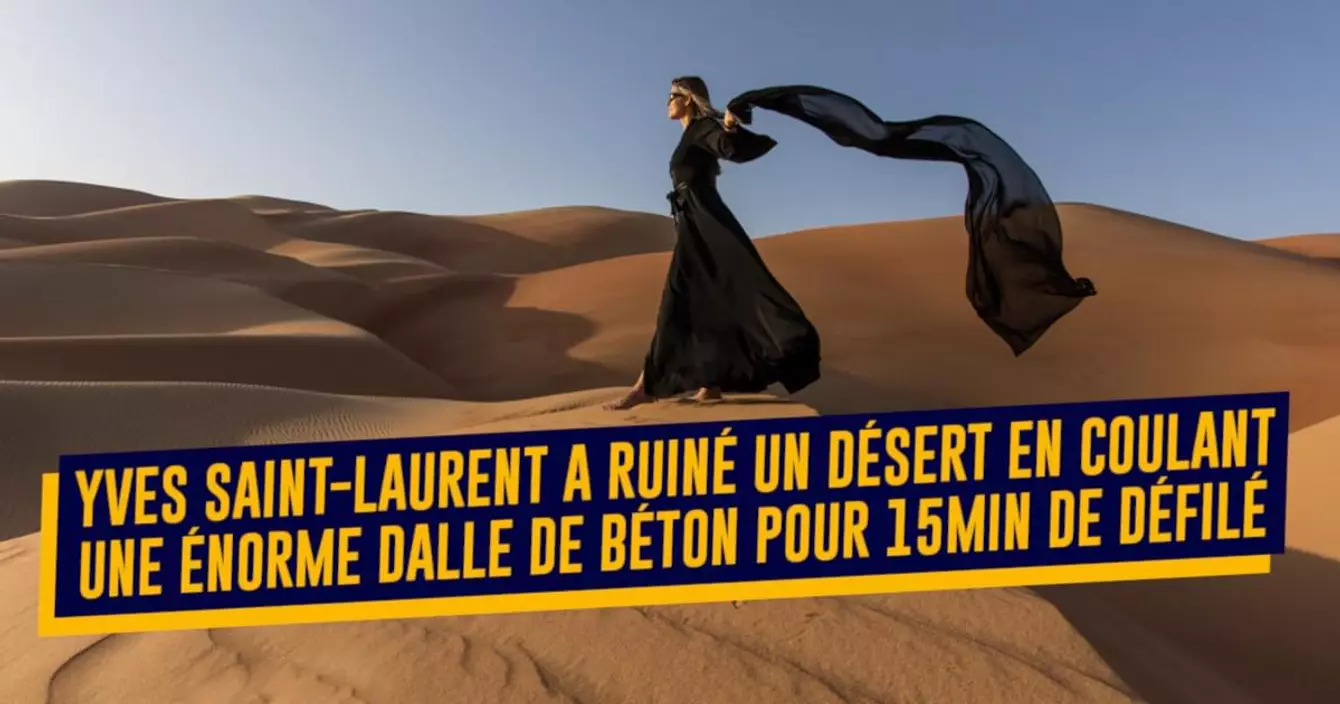 Quand la maison Yves Saint-Laurent (c'est pas vraiment une maison le truc, c'est un moyen de dire l'institution si vous préférez) a décidé de faire un défilé en plein désert d'Agafay au Maroc les organisateurs sont allés un peu loin : ils ont coulé une énorme dalle de béton dans laquelle ils ont balancé des litres de flotte, ruinant à jamais un paysage naturel pour un show de 14 minutes. Mais il y avait aussi des piscines, des climatiseurs, une route de plusieurs kilomètres et tout un tas de trucs qui ne font pas trop respect de l'environnement.