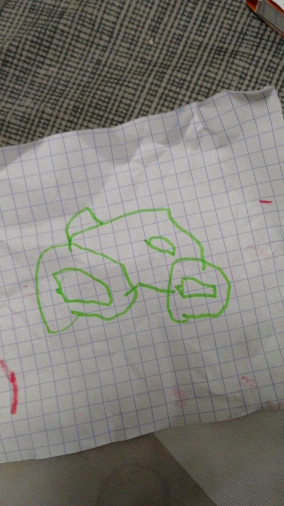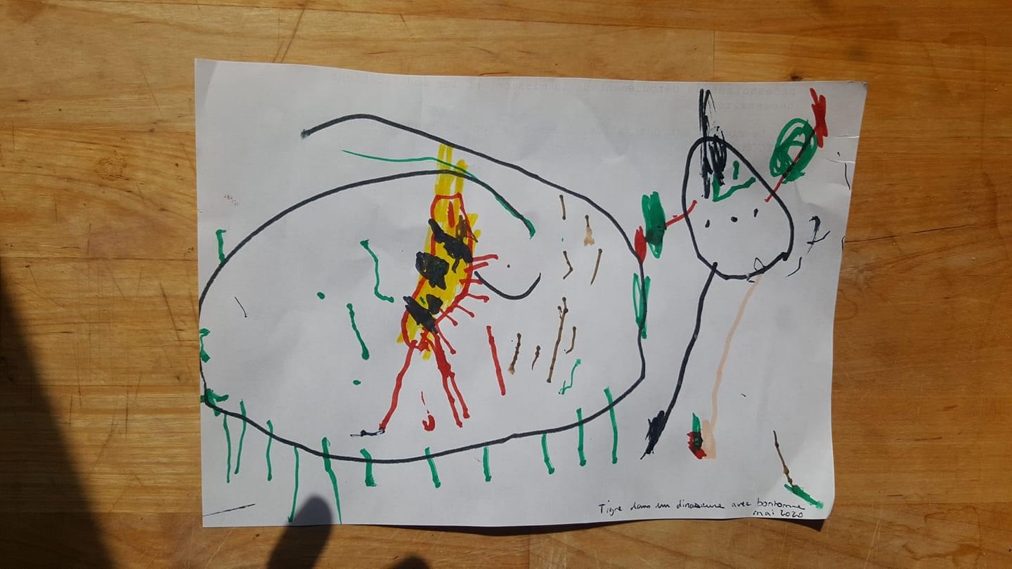 Abel, 5 ans. Il est hyper doué en dessins et activités plastiques mais là… Heureusement nous avons élevé nos enfants dans le second degré, l’ironie et l’auto-dérision. Donc quand je lui ai dit que c’était une bouse et que ça valsait à la poubelle, il a répondu « wè, hyper-poubelle ! ». ?