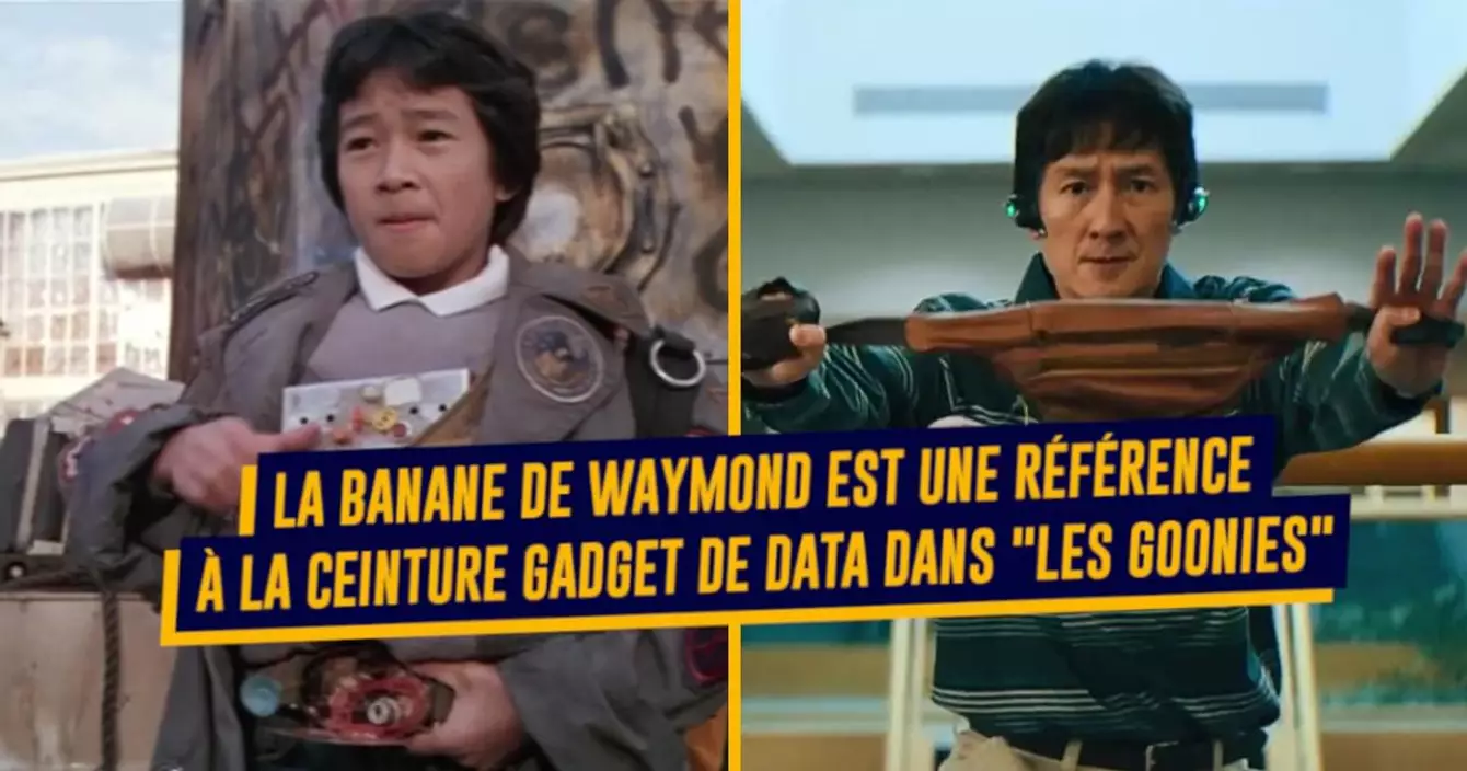 Ke Huy Quan joue Waymond dans les différents univers parallèles du film. Lors de la scène de baston au centre des impôts, Alpha Waymond utilise son sac banane comme une arme extrêmement efficace. C'est probablement un clin d'oeil à la ceinture gadget de Data dans Les Goonies, rôle que campait l'acteur à l'âge de 13 ans.
