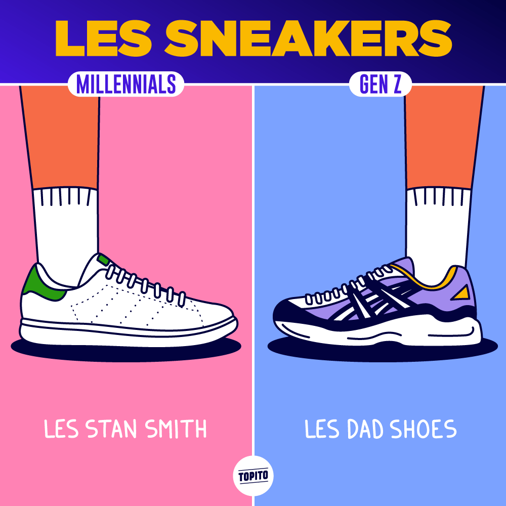 Des grosses baskets en toutes circonstances pour les Gen Z face aux petites baskets blanches chez les Millenials