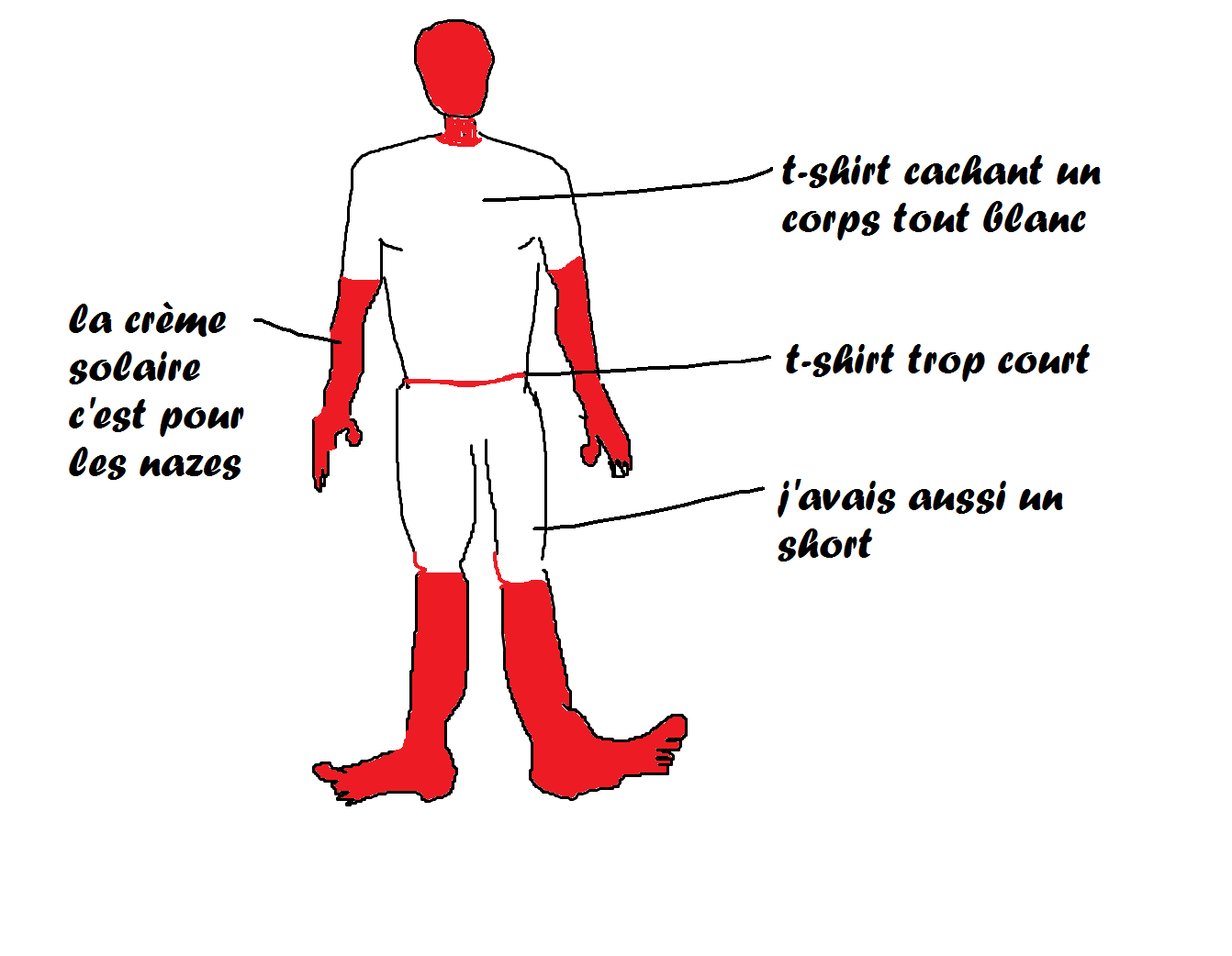 Les vacances, c'est bien, c'est super, on bronze, on prend un bain de soleil, on kiffe. Et on crame comme des merdes parce que le soleil c'est une sale petite frappe qui fait tout pour qu'on se transforme en écrevisse. A chacun sa manière de prendre des couleurs virant à l'infrarouge.