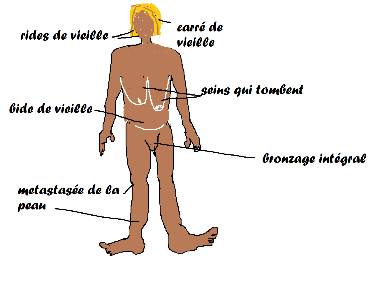 Elle est là, en intégrale, sur la plage, couleur caca sans chemise, sans pantalon, qu'on dirait Rika Zaraï, qu'on dirait qu'elle compte aller au Macumba s'enfiler des cocktails et se faire de la gigole, elle est là, elle est triste, c'est la vieille.