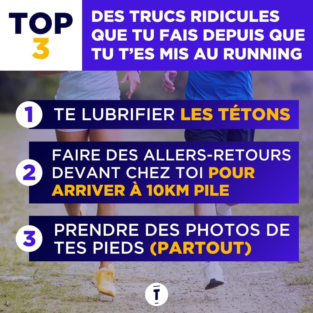 Tous les dimanches matins, il est levé à 6h pour aller faire « la course des fraises », « les foulées des Weppes » ou « le 10km de Perpettes-les-Bourgerons ». Absolument rien ne peut l'empêcher d'enfiler ses baskets pour aller courir dans des trous perdus. Surtout que ses baskets, il les a payées 250 boules donc il a intérêt à les utiliser.