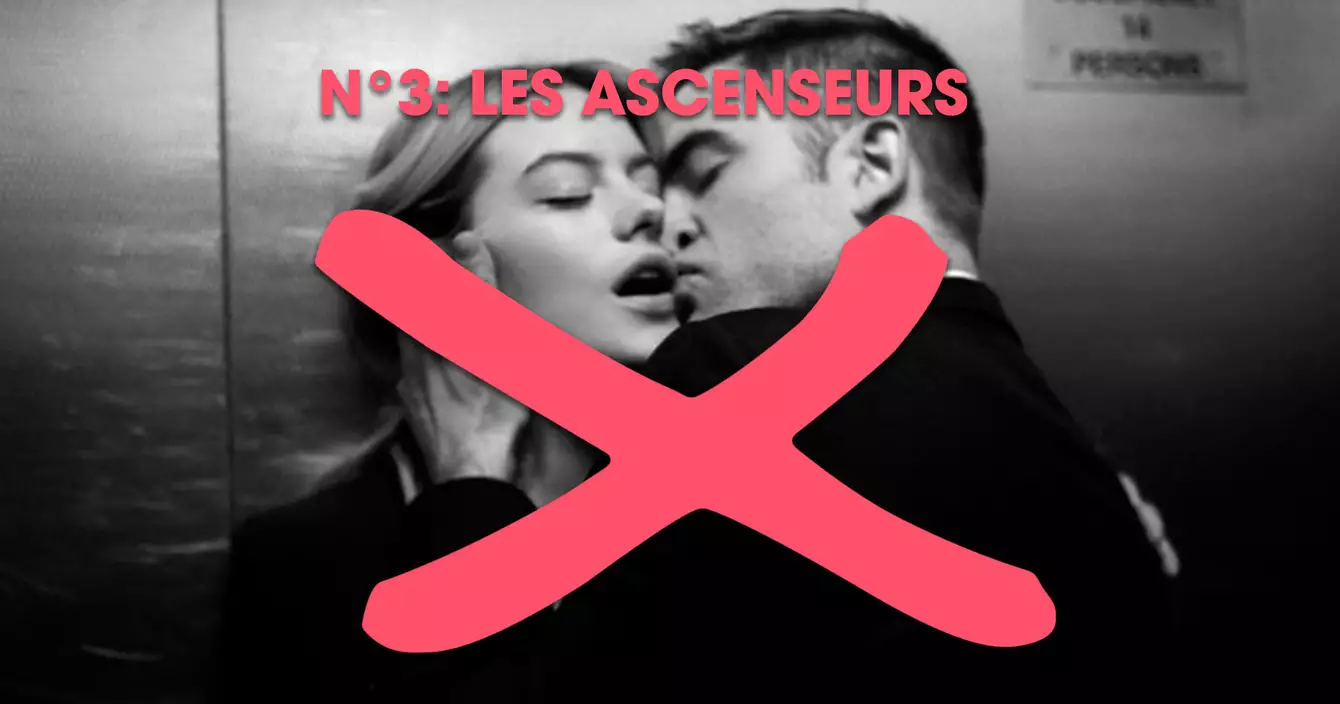 Dans les films : Il s’arrête entre deux étages, il fait noir et quand la lumière se rallume les deux jeunes beaux phénomènes sont en train de se grimper dessus et finissent sur le sol en criant beaucoup. Quand ils ont terminé, l’ascenseur reprend, et ils ont juste le temps de se rhabiller avant qu’une vieille rentre et lance un regard accusateur à la fille qui remet son blazer. Halala, qu’est-ce qu’on rigole bien.