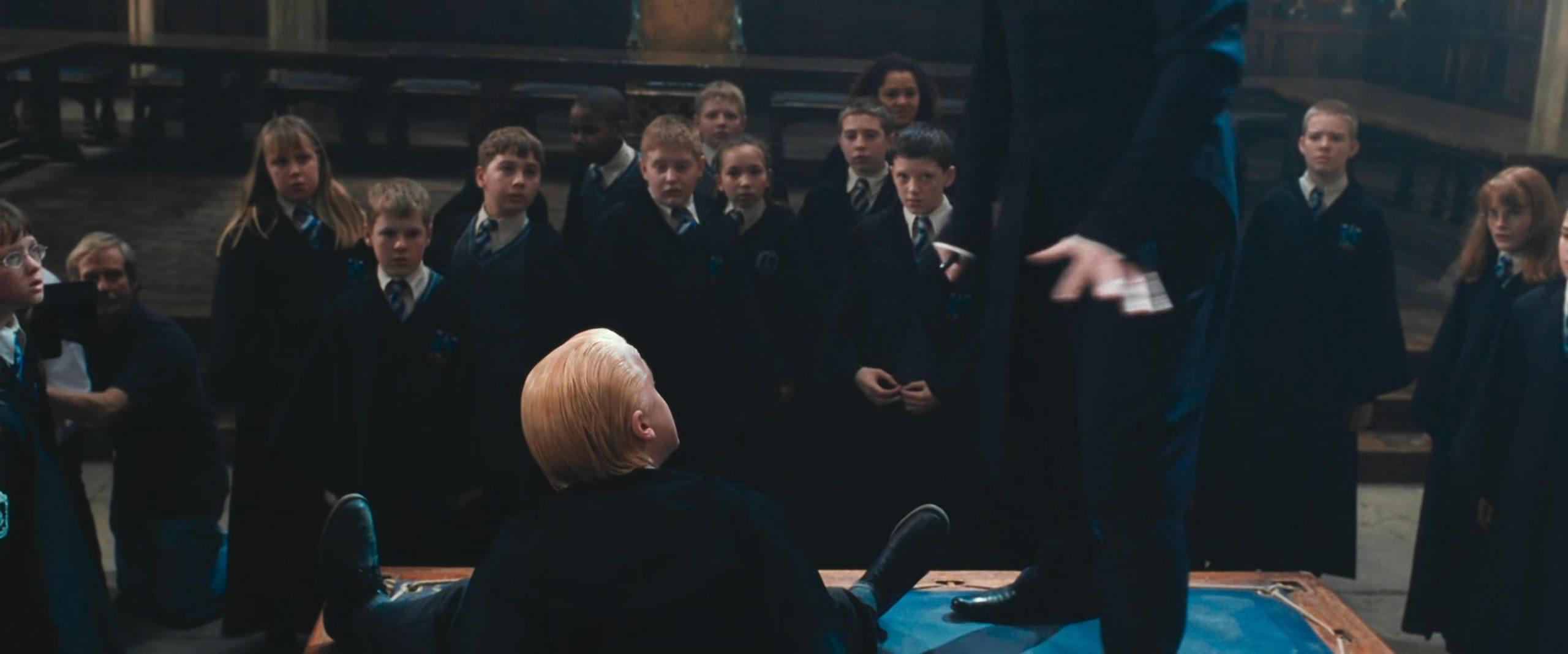 Toujours pendant la première séance du Club de Duel, Harry se retrouve face à Drago et lance un sort qui projette Malefoy en arrière. Quand Rogue l'aide à se relever, on remarque derrière eux la présence d'un cameraman en pull. Heureusement qu'il n'était pas en chemise hawaïenne.