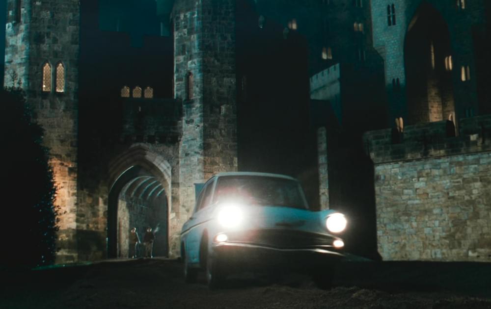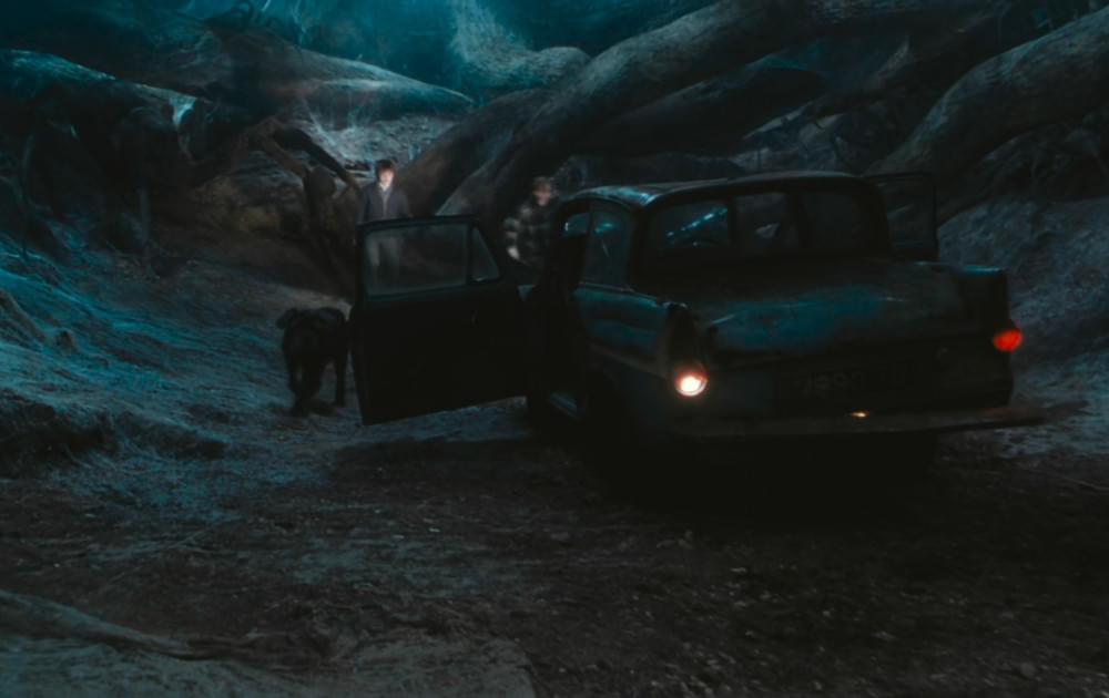 Arrivés à Poudlard, Ron et Harry se font éjecter de la voiture avec leurs bagages. La voiture s'enfuit ensuite sans conducteur, poursuivie par les deux enfants. Sans conducteur ? Pas vraiment. On peut en effet apercevoir sa silhouette et ses mains sur le volant.