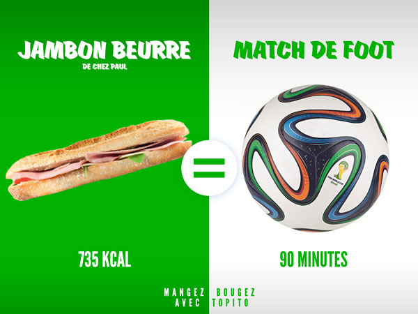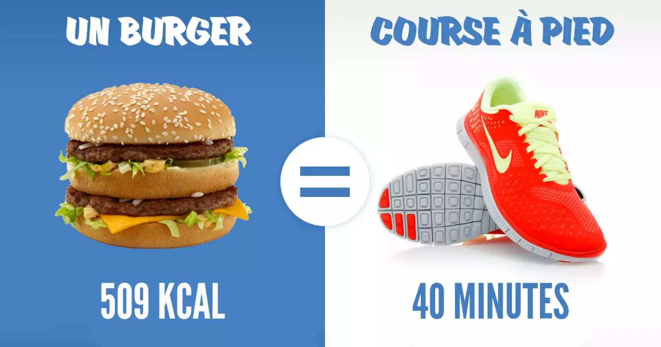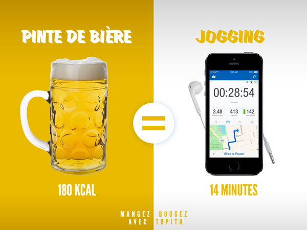 Chez Topito, on aime manger. Surtout ce qui est très gras et très calorique. Mais comme on veut préserver nos corps d'athlètes (oui, oui !), il nous faut nous dépenser à chaque calorie prise en trop. Pour nous aider dans nos exercices, on a simplement fait des calculs très scientifiques avec des quantités moyennes en faisant des sports à des vitesses moyennes pour quelqu'un avec un poids moyen (70kg). Beaucoup de moyenne pour vous faire comprendre que si vous mangez trop, il va falloir vous dépenser. Je vous conseille de poser cette pinte de binouze tout de suite et d'aller courir !