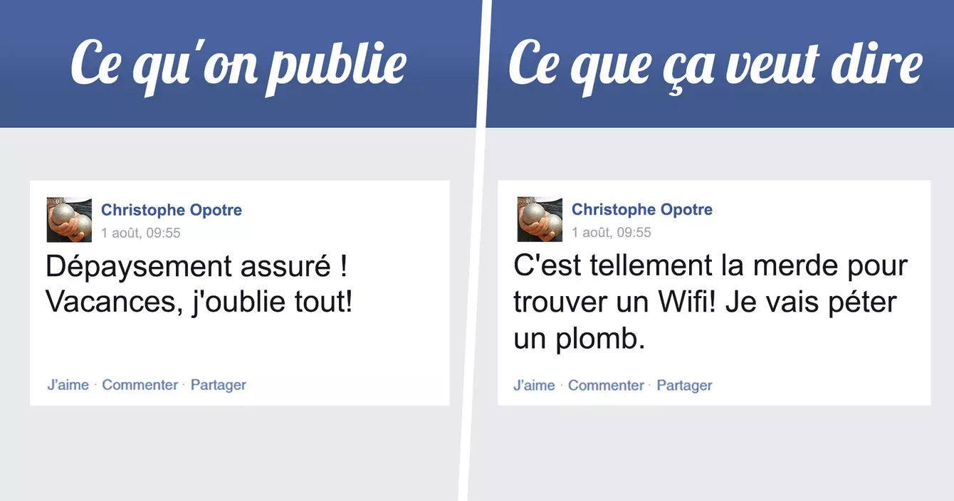 Avant les gens partaient en vacances vous n'aviez pas de leurs nouvelles et puis parfois vous receviez une carte postale un peu moche qui vous rappelait que, dans leur bonheur, ils avaient quand même un peu pensé à vous. Mais aujourd'hui les gens qui partent se sentent obligés de partager TOUT ce qu'ils font. Et on ne peut s'empêcher de penser qu'ils mentent les salopards.