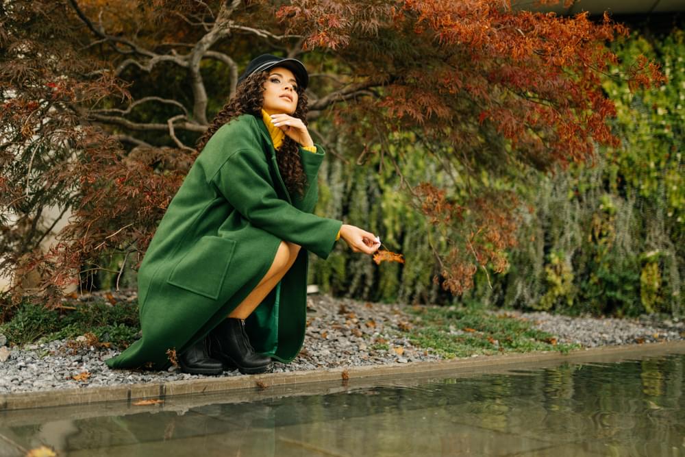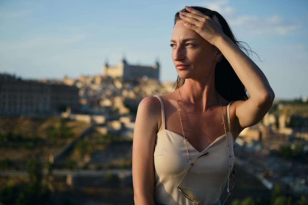 En te touchant les cheveux, les yeux vers l'horizon