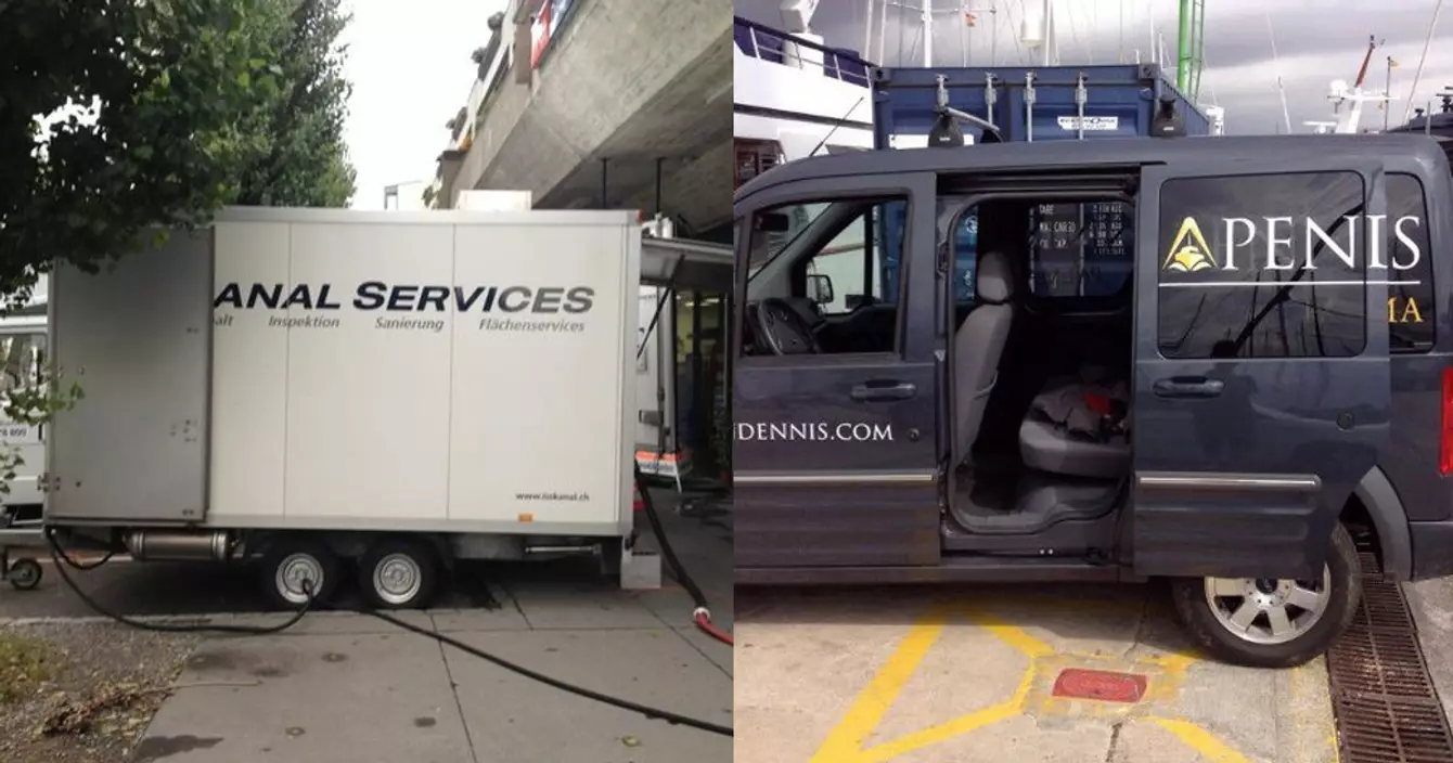 Quand on colle une pub sur une camionnette, on ne pense pas toujours que cette camionnette va vivre, ouvrir ses portes et ses fenêtres et que, conséquemment, l'emplacement des lettres formant un mot sur les parois de la bagnole changera. Et parfois de manière assez peu heureuse. Voire franchement malheureuse.