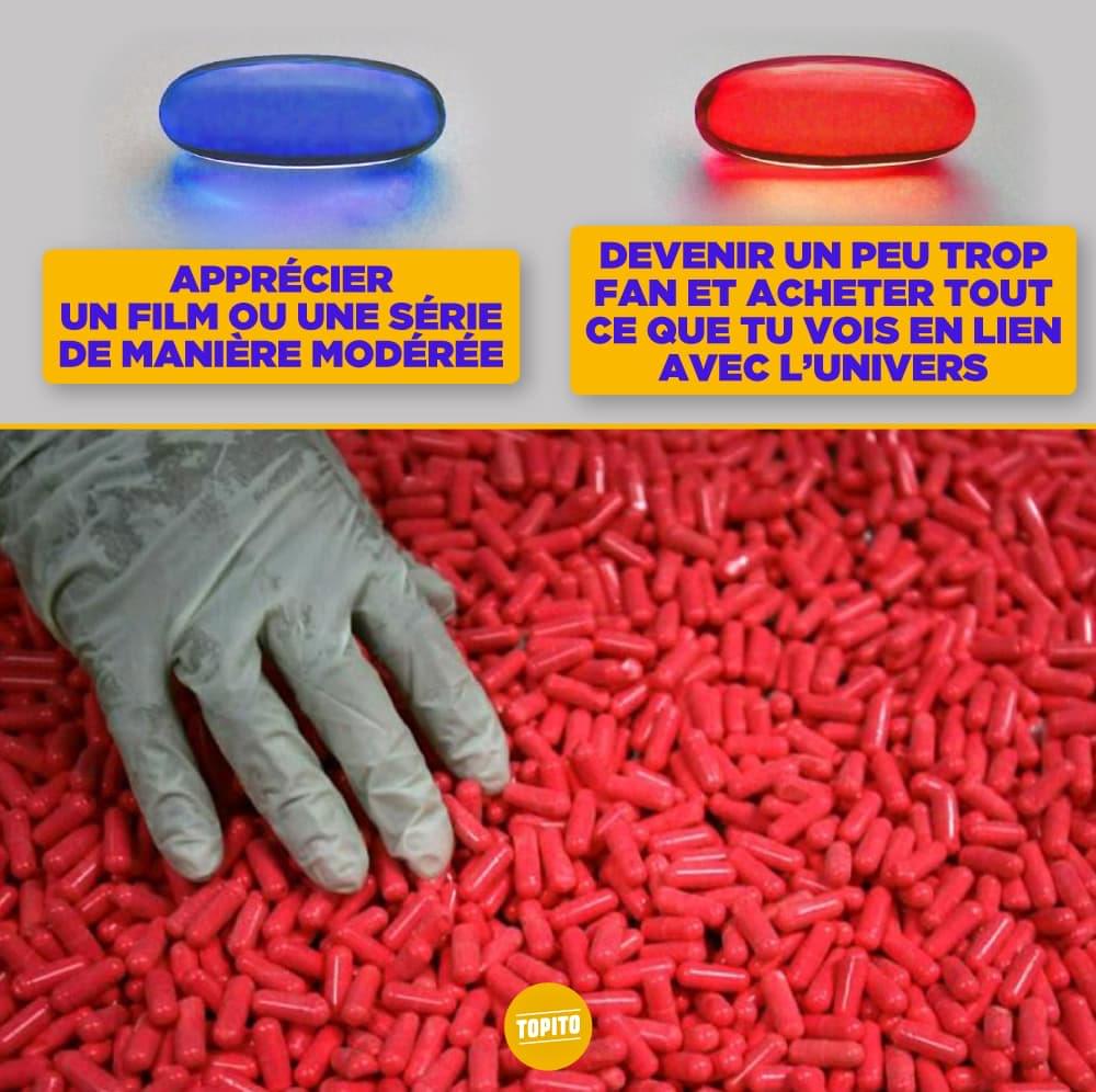 C'est évidemment le film des complotistes par excellence. Plusieurs éléments du film tels que le lapin blanc, la pilule bleue et la pilule rouge sont régulièrement repris dans le vocabulaire de la complosphère. Faut dire que l'histoire du film qui se réapproprie l'allégorie de la caverne de Platon, c'est du pain béni pour tout complotiste qui se respecte : des machines nous contrôlent, la vérité nous est cachée, seul un regard éclairé peut sortir de la caverne. C'est sûr que dans Les Bronzés, on est moins porté sur ce genre de questions existentielles.