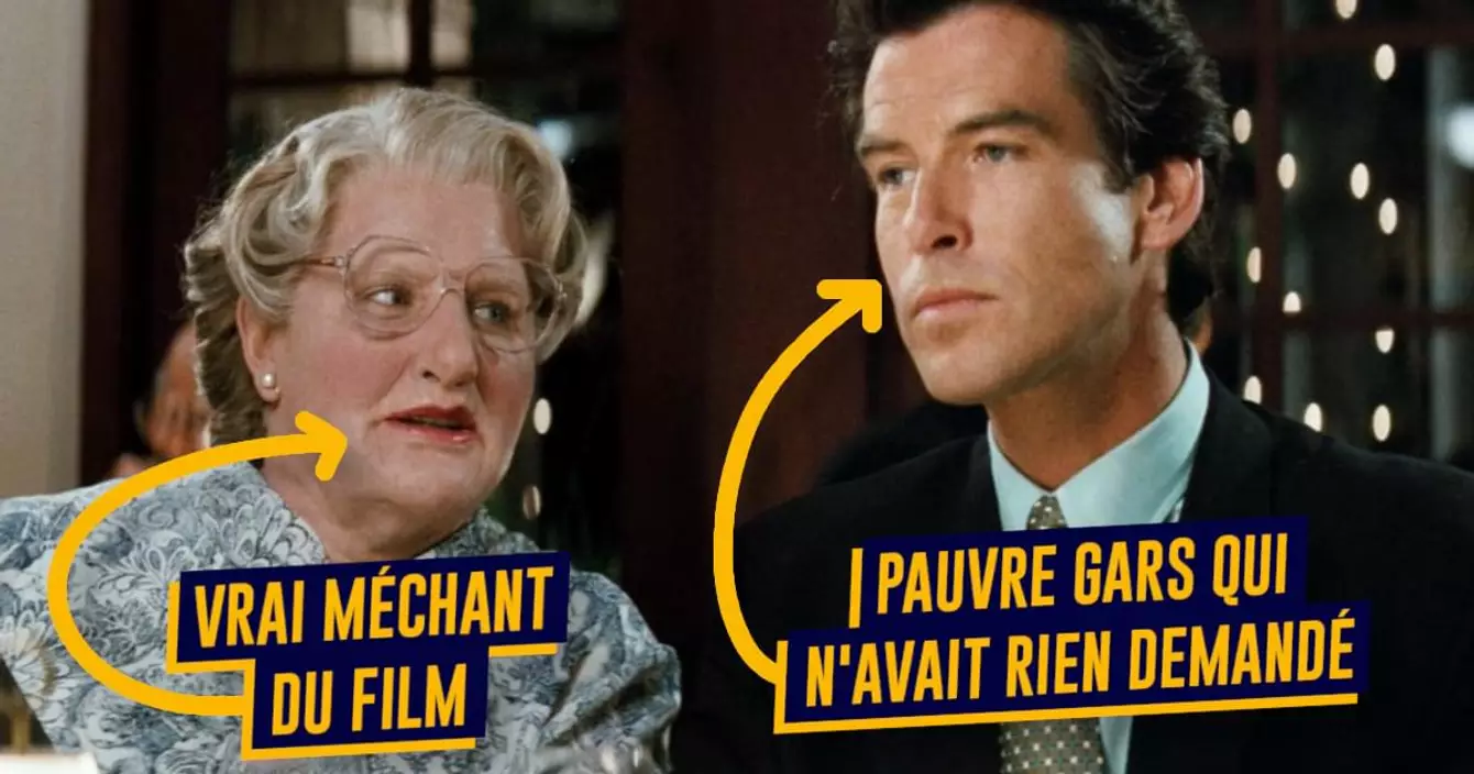 Dans Madame Doubtfire, Daniel (Robin Williams) est divorcé et sa femme Miranda a obtenu la garde des enfants. Miranda s'est mise en couple avec Stuart (Pierce Brosnan) qui vit donc désormais avec les enfants de sa meuf. Concrètement, c'est juste un beau-père pas bien méchant, mais comme le film prend le parti de Daniel, on le voit comme un gros connard, alors que c'est Daniel le gros ouf qui se déguise en vieille dame pour continuer à voir ses gosses. En plus, Daniel fout du poivre dans le plat de Stuart en sachant qu'il y est allergique. Il mériterait clairement de finir en taule.