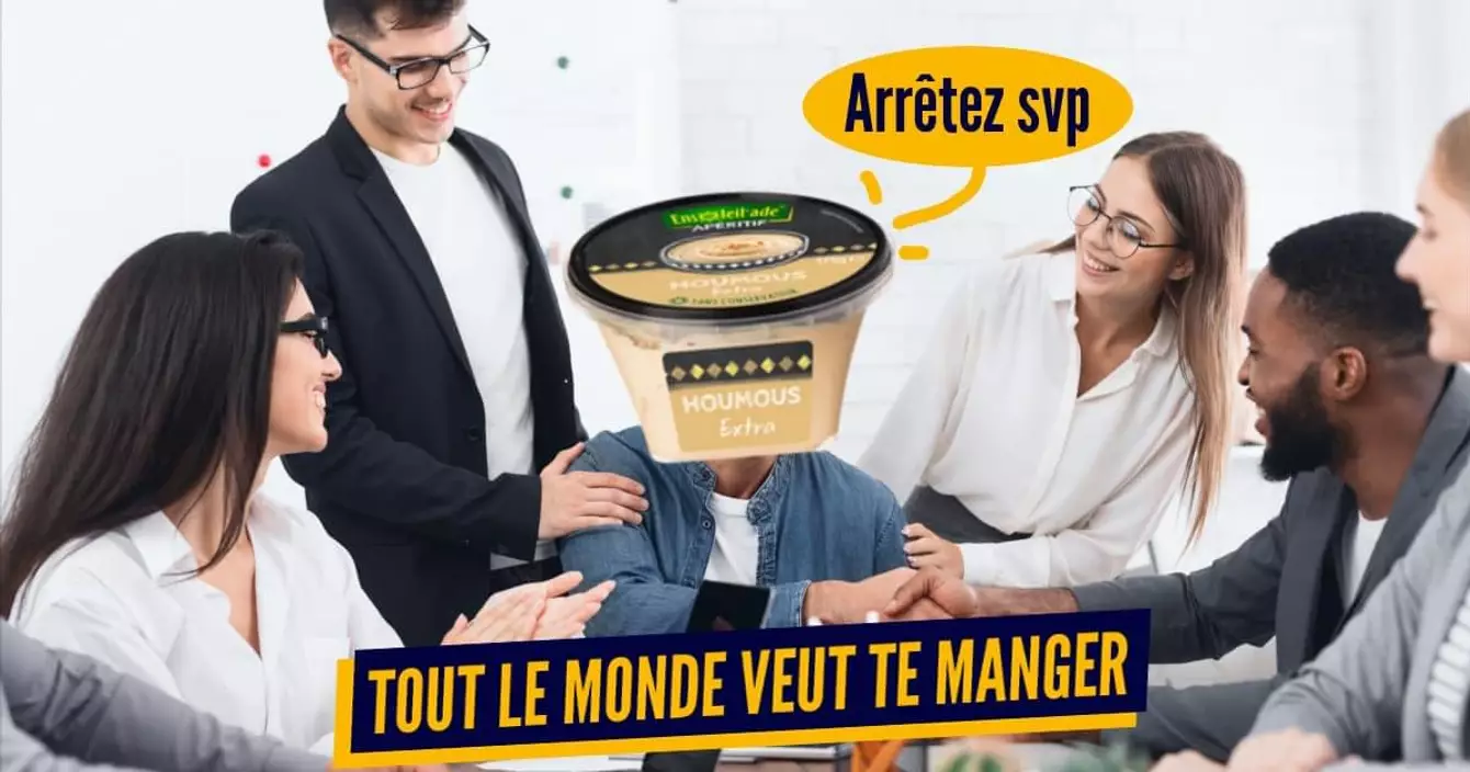 Chers amis, il nous faut prendre la parole sur un sujet grave. Le quotidien difficile… du houmous. Cette pâte granuleuse à base de pois chiche broyés et d'huile d'olive saupoudrée d'une pincée de cumin fait des ravages dans les palais les plus et les moins raffinés, mais dans le fond, qui est le houmous ? Quels sont ses sentiments ? Et si on creusait un peu derrière cette recette culinaire pour en dévoiler, qui sait… l'humanité ?