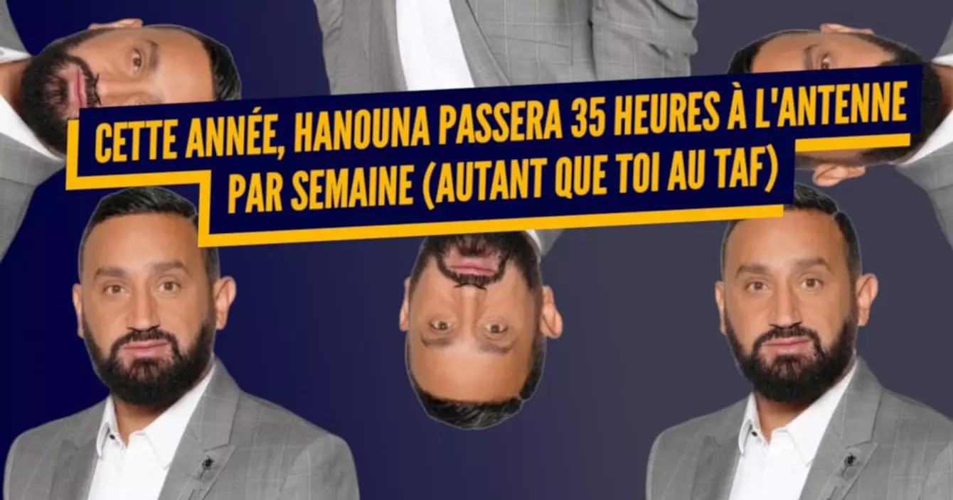 A partir de septembre 2019, Cyril Hanouna cumulera 35 heures d'antenne hebdomadaire sur C8 et Canal. C'est beaucoup, puisque c'est autant que de temps que nous passerons vous et moi au bureau à ne pas regarder Hanouna, à moins, bien sûr, que votre travail ne consiste à regarder Hanouna auquel cas on vous plaint et on est prêt à signer une pétition pour que vous puissiez prendre votre retraite à 12 ans.