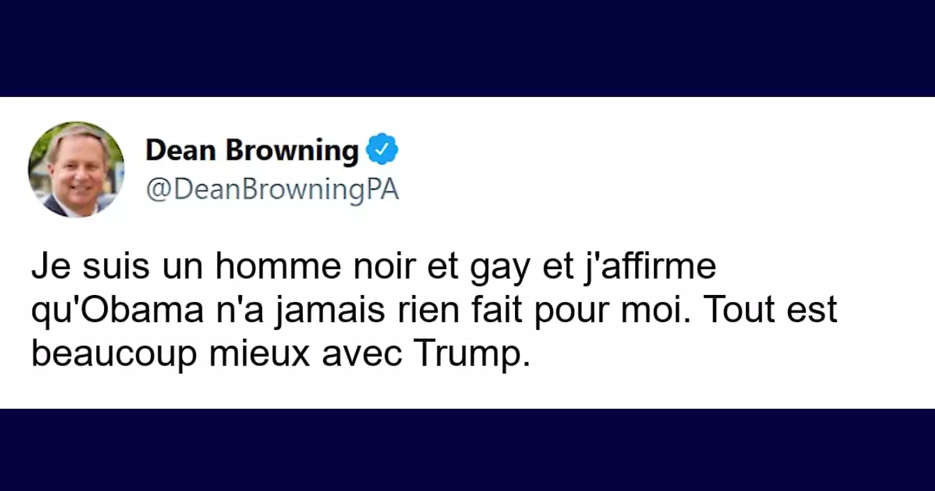 Dean Browning, c’est un politicien pro-Trump, donc il a voulu défendre son copain Donald sur Twitter pendant les élections. Après avoir critiqué Biden dans un premier tweet (il disait que Biden allait détruire ce que Trump avait construit), il a reçu une réponse d’un internaute qui disait que Trump avait déjà détruit ce qu’Obama avait construit. Et là, Dean Browning a eu une idée de génie : il a voulu répondre en se faisant passer pour un homme noir et gay afin de critiquer Obama. Problème : il a oublié de changer de compte. Ça donne ça :